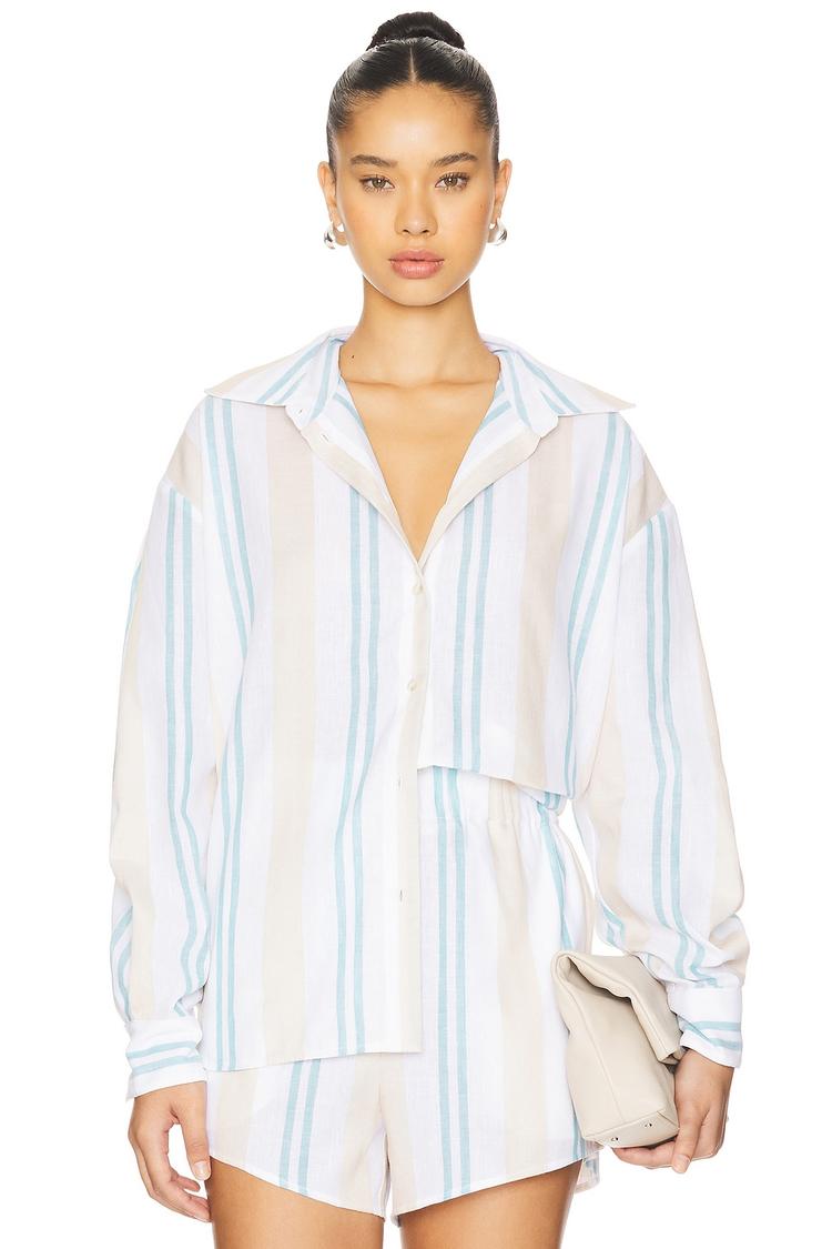 Soft, breathable linen and a relaxed fit come together in this classic Arezzo top featuring subtle vertical stripes in light blue and beige on a crisp white base. With a traditional collar, long buttoned sleeves, and front button closure, its hip-length silhouette offers effortless style and comfort. Ideal for casual brunches, business casual days, and travel, this versatile piece blends minimalist design with timeless appeal to elevate everyday looks with ease.