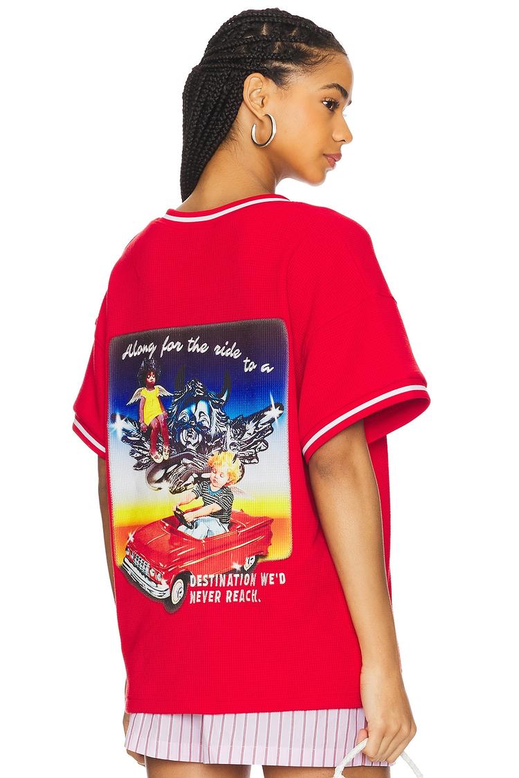 Vibrant red waffle-knit fabric with cozy fleece lining defines this athletic jersey with a loose fit and classic V-neck. Half sleeves with white trim and bold graphic prints on front and back add sporty, street style appeal. The hip length and pullover design make it easy to wear for casual outings, everyday errands, or streetwear looks. Crafted from a polyester-rayon-spandex blend, it balances comfort and stretchability, perfect for all-weather versatility and relaxed style.