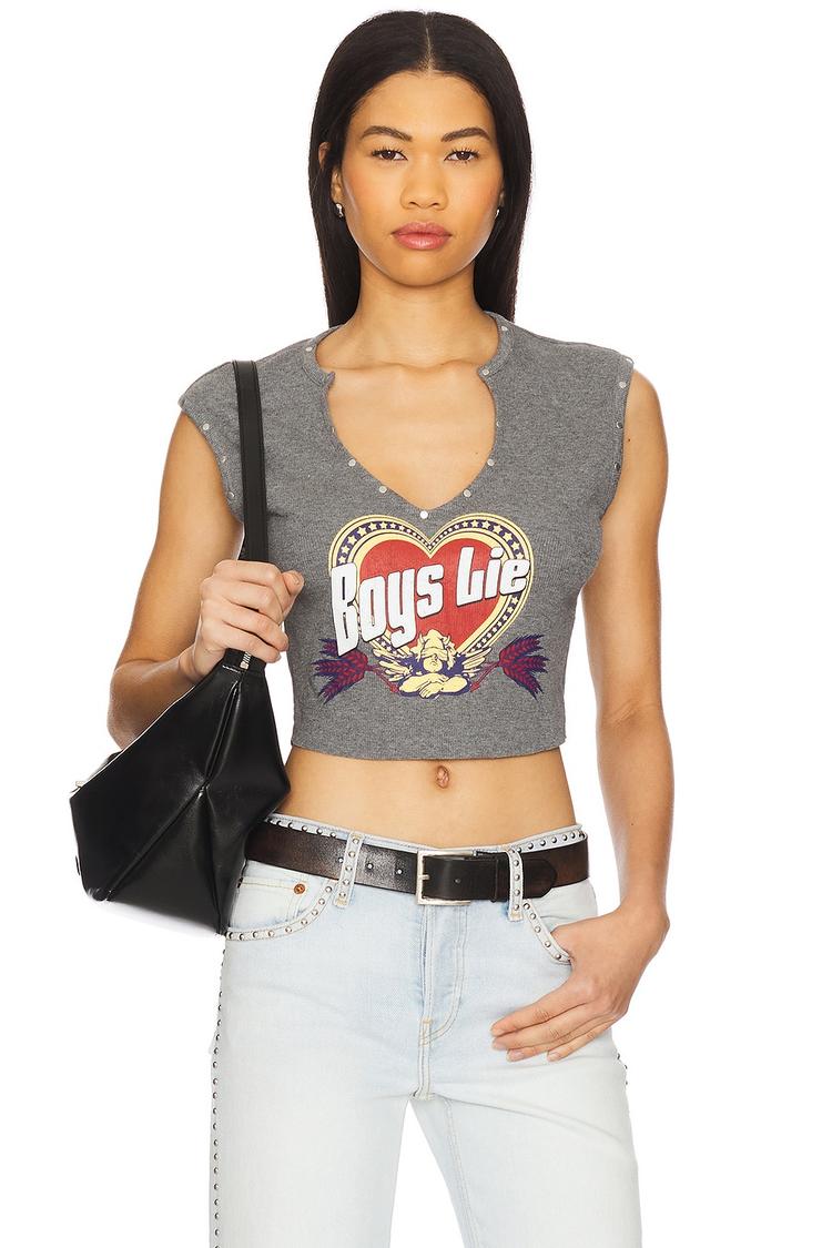 Ribbed jersey fabric with a raw cut hem gives this fitted tank top a rebellious edge. Featuring a graphic print front and metal eyelet embroidery along the trim, the cropped length and sleeveless wide straps enhance its casual chic vibe. The V-neckline adds a flattering touch, making it perfect for spring and summer street style looks. Ideal for casual outings, everyday wear, or brunch dates, this Boys Lie tank combines comfort with bold design details for an effortlessly edgy statement.