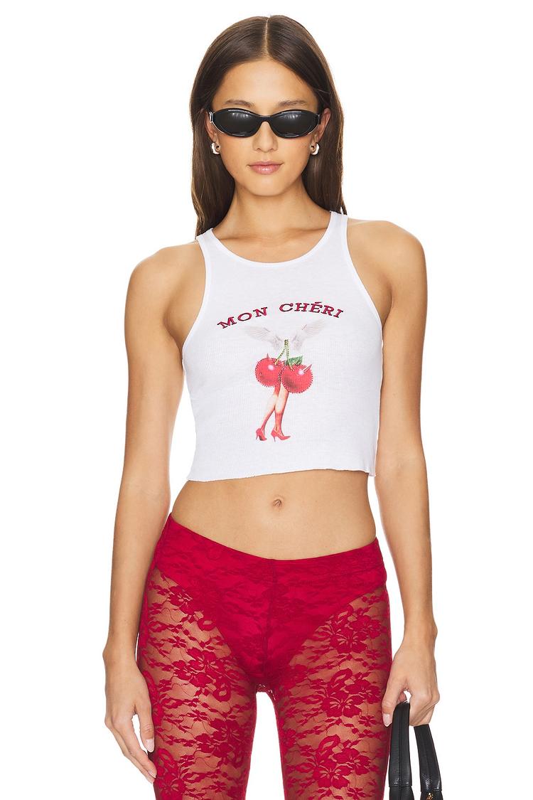 A crisp white cropped tank crafted from a soft rib knit blend of cotton, polyester, and rayon offers a fitted silhouette perfect for warmer days. Featuring sleeveless styling with a round neckline and striking front and back graphics, this tank blends casual chic with street style vibes. Ideal for casual outings, streetwear looks, or everyday wear during spring and summer, it pairs effortlessly with bold bottoms to create a youthful and edgy ensemble.