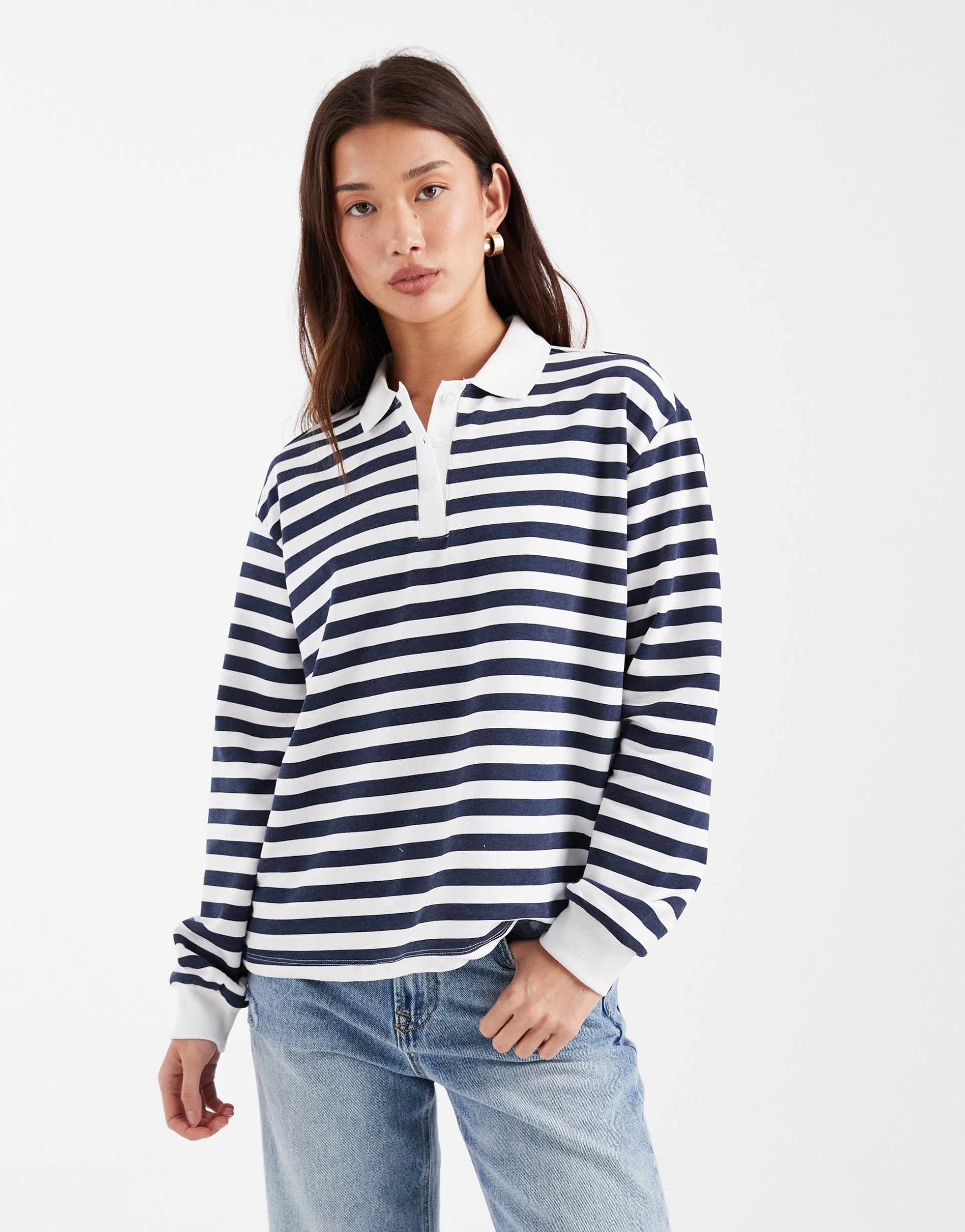 Soft and stretchy jersey fabric defines this classic polo top featuring a relaxed fit and long sleeves for all-weather comfort. The iconic navy and white striped pattern runs all over, paired with a traditional polo collar and button placket for timeless sporty chic style. With its hip length and regular sleeve styling, this versatile piece suits casual outings, everyday wear, travel, and even smart-casual work environments. Crafted from a cotton-polyester blend, it delivers breathable comfort with a subtle stretch that moves with you.