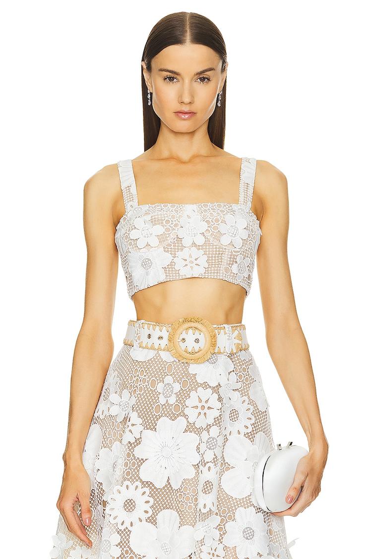 Delicate white lace overlays a fitted boned bodice to create a striking cropped corset top with a square neckline and wide adjustable straps. The exposed back zipper adds modern edge while the floral pattern brings feminine elegance. Crafted from a viscose-cotton blend with polyester lining, this breathable top is perfect for spring and summer outings. Ideal for casual brunches, date nights, or stylish evenings out, it pairs beautifully with high-waisted skirts or pants for versatile chic looks.