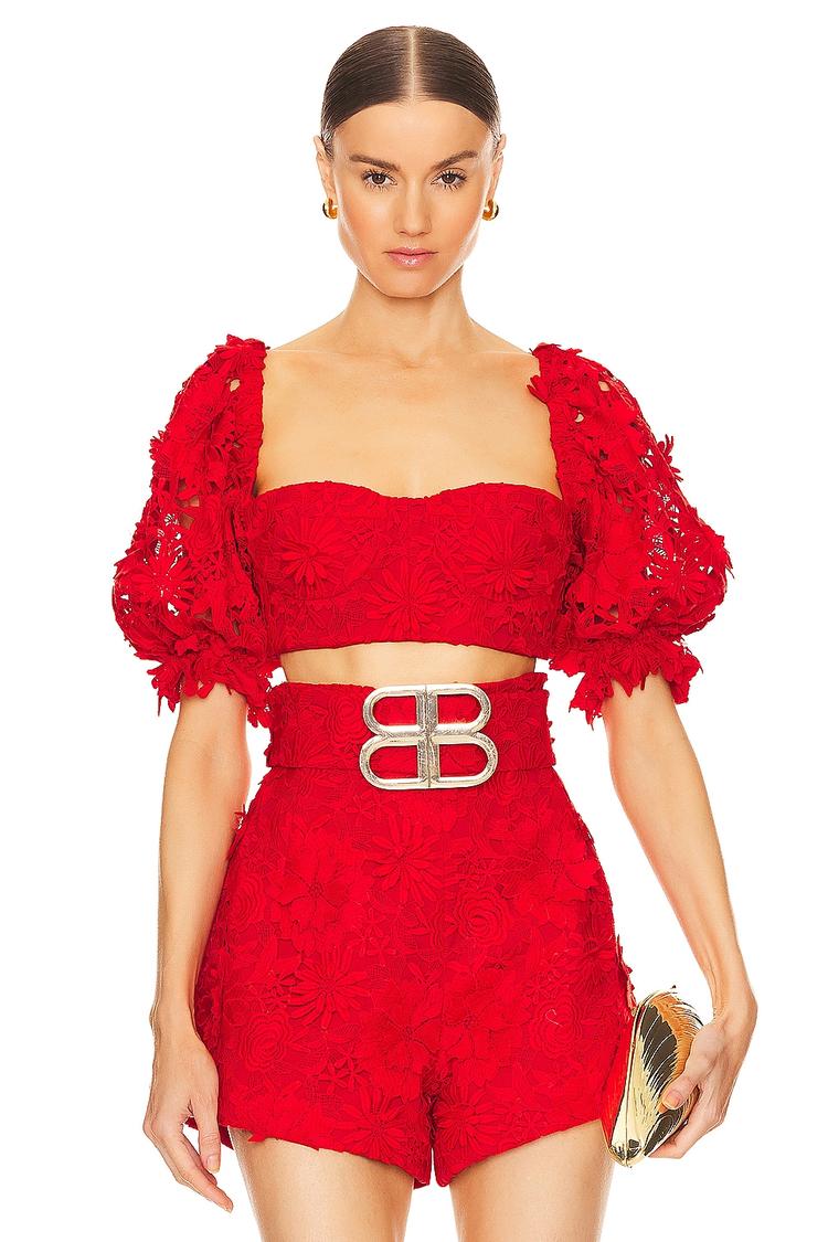 Delight in the vibrant red Sicilia Bralette featuring a fitted cropped silhouette crafted from breathable cotton with a delicate lace overlay. Its romantic puffed half sleeves with elastic cuffs and ruffle details lend a playful yet chic appeal, complemented by a straight neckline and an exposed back zipper for ease and style. Ideal for spring and summer, this bralette pairs perfectly with high-waisted bottoms for casual outings, brunch dates, or night outs, making it a trendy choice that blends comfort with statement-making design.