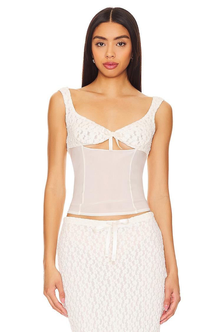 Delicate lace and a structured corset silhouette define this fitted waist length top, featuring a square neckline and wide straps for a flattering sleeveless look. The front keyhole with tie-up detail adds a subtle charm, while the blend of polyamide, organic cotton, and a hint of polyurethane creates a comfortable yet supportive feel. Ideal for spring and summer, this chic and elegant piece transitions seamlessly from casual brunches to sophisticated night outs and relaxed daytime outings.
