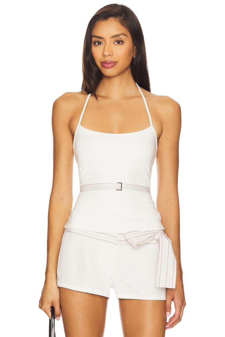 Lightweight jersey fabric and a fitted silhouette define this white tank top, featuring a chic square neckline and delicate spaghetti straps for a minimalist summer vibe. The halterneck tie closure at the back adds a subtle adjustable detail, while the detachable waist belt with a silver buckle enhances the waistline, creating a flattering shape. Ideal for casual beach days, poolside lounging, or vacation wear, this versatile hip-length tank offers effortless style and comfort in warm weather.