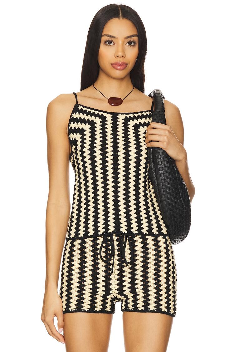 Midweight crochet knit fabric shapes this bohemian-inspired camisole featuring a striking chevron pattern in matte black and beige. The regular fit and waist length silhouette are complemented by delicate spaghetti straps and a square neckline, while the back tie closure adds a charming, adjustable detail. Perfect for warm spring and summer days, this versatile top is ideal for casual outings, brunch dates, or vacation wear, delivering both comfort and style with its breathable cotton-polyester blend.