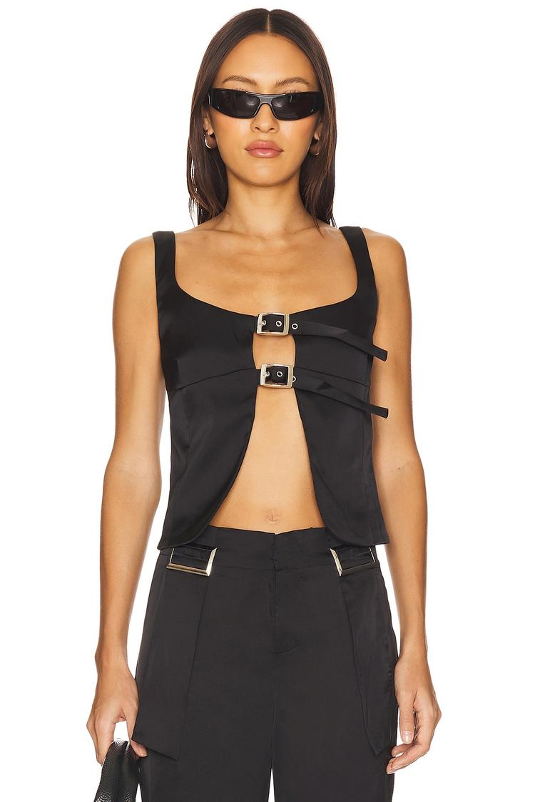 Sleek and contemporary, this slim-fit tank top features a square neckline and wide straps crafted from midweight matte black satin. The standout front buckle closures and deep cut-out design lend an edgy vibe perfect for nights out, casual weekends, or date nights. Made from a polyester-elastane blend, it offers a comfortable stretch and smooth finish. The waist-length hemline balances modern style with wearable comfort, making it a versatile addition to any chic wardrobe.