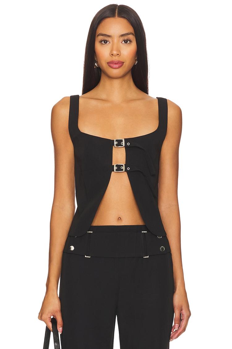A sleek matte black crepe camisole featuring a cropped length and slim fit that contours the body beautifully. The square neckline and wide straps add modernity, while the dual front buckle closure introduces an edgy, standout detail. This versatile piece is perfect for casual outings, vibrant brunches, or stylish night outs. Its covered back and sleeveless design keep it fresh and wearable across all seasons, making it a chic addition to any contemporary wardrobe.