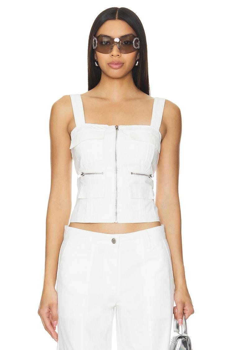 Clean lines and a crisp white cotton blend define this fitted cropped corset top, featuring a square neckline and wide straps for a modern edge. The front zipper closure and exposed silver zippers add subtle utilitarian flair, while the lightweight twill fabric ensures comfort and breathability. Perfectly suited for casual outings, streetwear looks, or brunch dates, this versatile piece brings a sharp, contemporary silhouette to your warm-weather wardrobe.