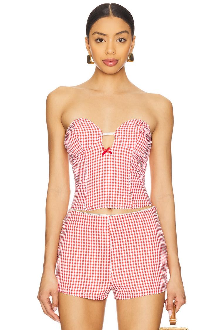 Structured with a fitted silhouette and a sweetheart neckline, this strapless corset top in a pink and white checkered seersucker fabric offers a playful yet polished look. Featuring a back zipper closure and a tonal red bow detail at the front, it provides both style and support with a non-slip silicone neckline and elastic bust strap. Perfect for spring and summer outings, this cropped corset is ideal for casual brunches, date nights, or night outs where a trendy and chic vibe is desired.