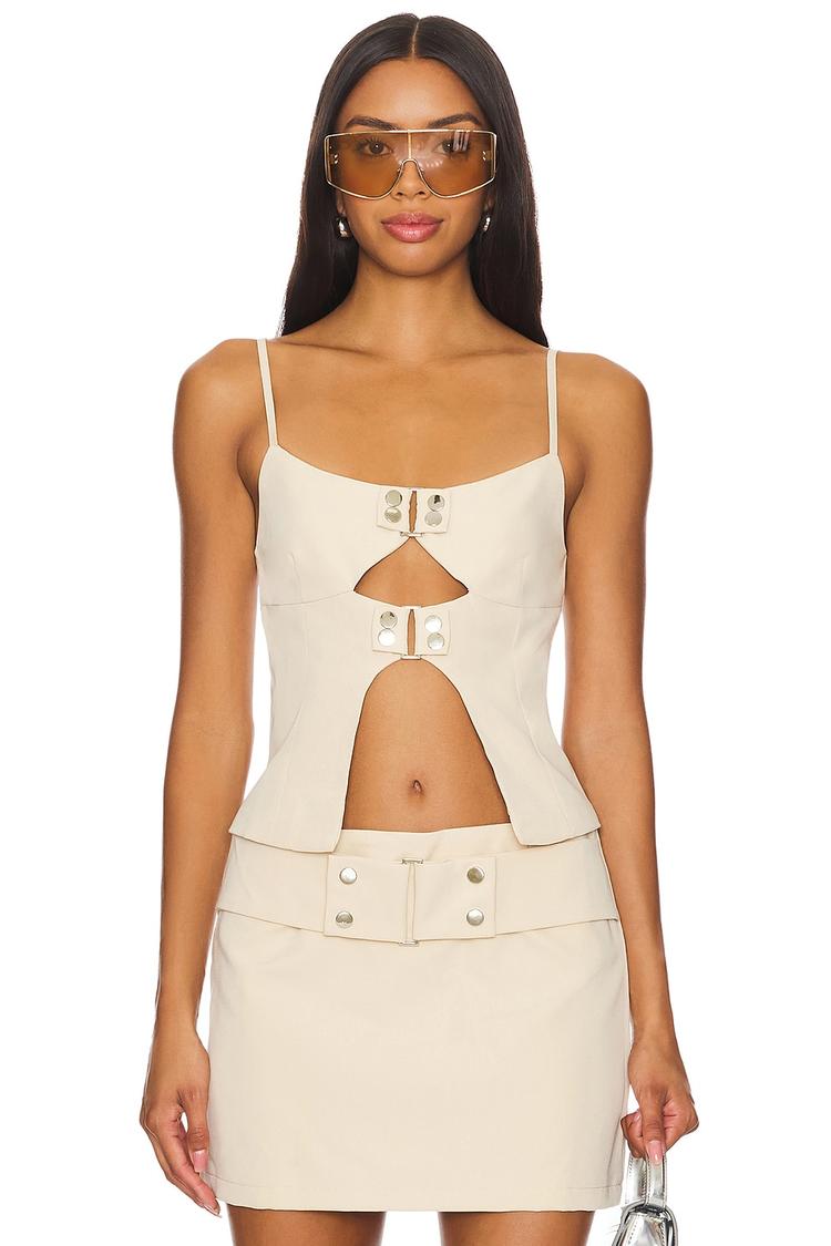 A sun-kissed essential with a modern edge: the Ren Top from By.Dyln in creamy crepe with a soft stretch. This cropped cami features delicate spaghetti straps, a flattering V-neck, and an open front secured by two snap buckles for a hint of utilitarian chic. The fitted silhouette and waist-skimming hem create a sleek, contemporary line that pairs effortlessly with a mini skirt or high-waisted denim. Dress it up with a blazer for evenings or keep it pared-back for daytime brunch—it's versatile, polished, and ready for warm-weather styling.