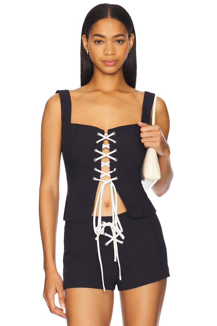 Sleek and fitted, this black corset top features a striking front lace-up detail with contrasting white ties, enhancing its modern and trendy appeal. Crafted from a smooth crepe fabric blend of polyester, rayon, and elastane, it offers a comfortable stretch and a flattering waist-length silhouette. The square neckline at front and back combined with wide straps adds a chic edge to this sleeveless piece. Perfect for spring and summer, it's ideal for casual days, brunch outings, or night outs where you want to make a confident style statement.