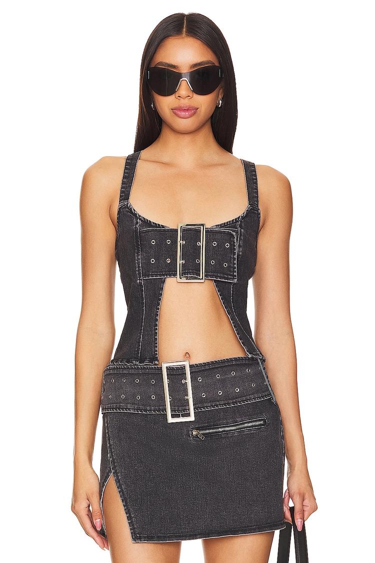 Rigid matte black denim shapes this fitted corset top with a bold square neckline and sleeveless design. Front buckles add edgy detail, while criss-cross straps at the back enhance its striking silhouette. This waist-length piece pairs perfectly with casual streetwear, date nights, or a night out, blending edgy style with summer-ready breathability. Crafted from a cotton-elastane blend, it offers comfort with structure and a contemporary street style vibe.
