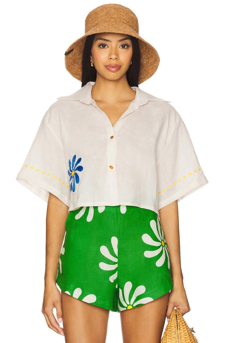 Lightweight linen and a cropped, loose fit give this Manaos Top a breezy, effortless vibe. The matte off-white fabric features intricate blue and yellow embroidery on the front and back, adding a bohemian flair to its casual chic style. Half sleeves with wide straps and a classic turn-down collar complete the relaxed silhouette. Ideal for spring and summer, this top suits casual outings, brunch dates, and vacation days with ease. Its semi-sheer texture enhances the airy feel, making it a standout piece for warm-weather wardrobes.