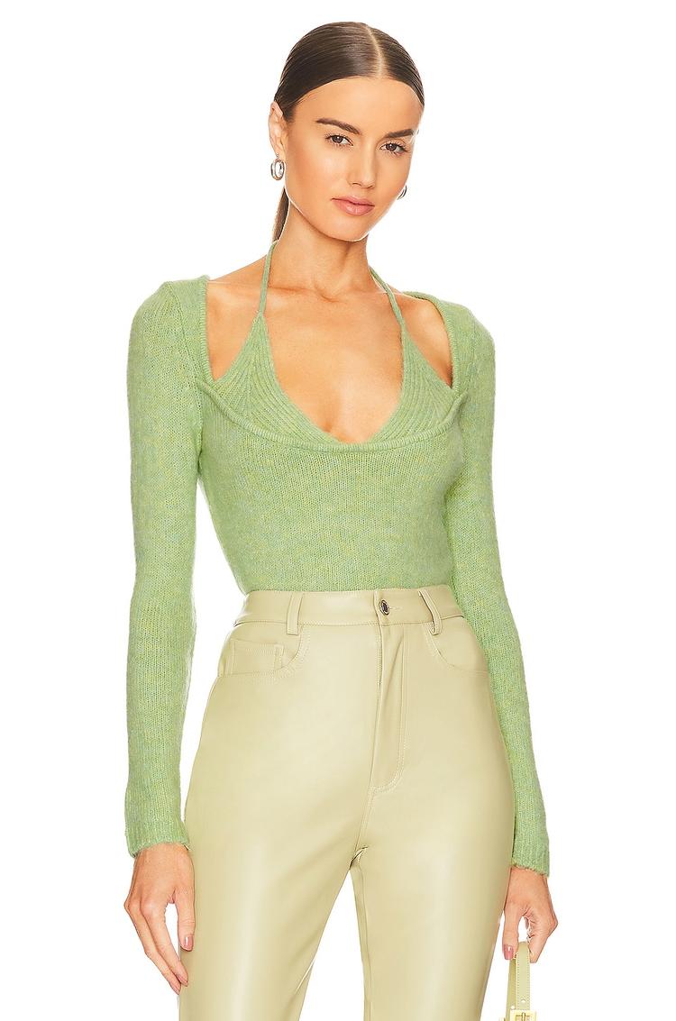 Softly textured in a fuzzy knit fabric, this fitted tank top features a distinctive halterneck tie that adds an elegant touch to the silhouette. Its long sleeves and waist-length cut offer warmth and style for autumn and winter seasons. The matte light green hue brings a fresh, modern vibe, while the tie-back closure enhances the chic appeal. Ideal for casual outings, brunch dates, or a relaxed evening, this top blends comfort with contemporary sophistication effortlessly.