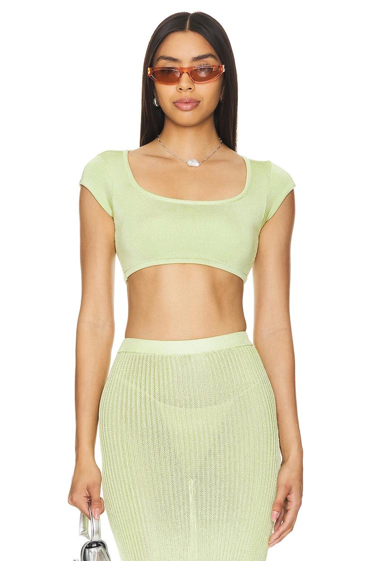 Soft stretch viscose blend fabric sculpts this fitted cropped top featuring a flattering scoop neckline and cap sleeves. Its minimalist design in a pale green hue offers effortless chic, ideal for warm spring and summer days. Designed with a covered back and easy slip-on closure, this versatile piece pairs perfectly for casual outings, brunch dates, or relaxed evenings. The cap sleeve styling and cropped length highlight a modern, streamlined silhouette that complements a variety of looks with understated elegance.