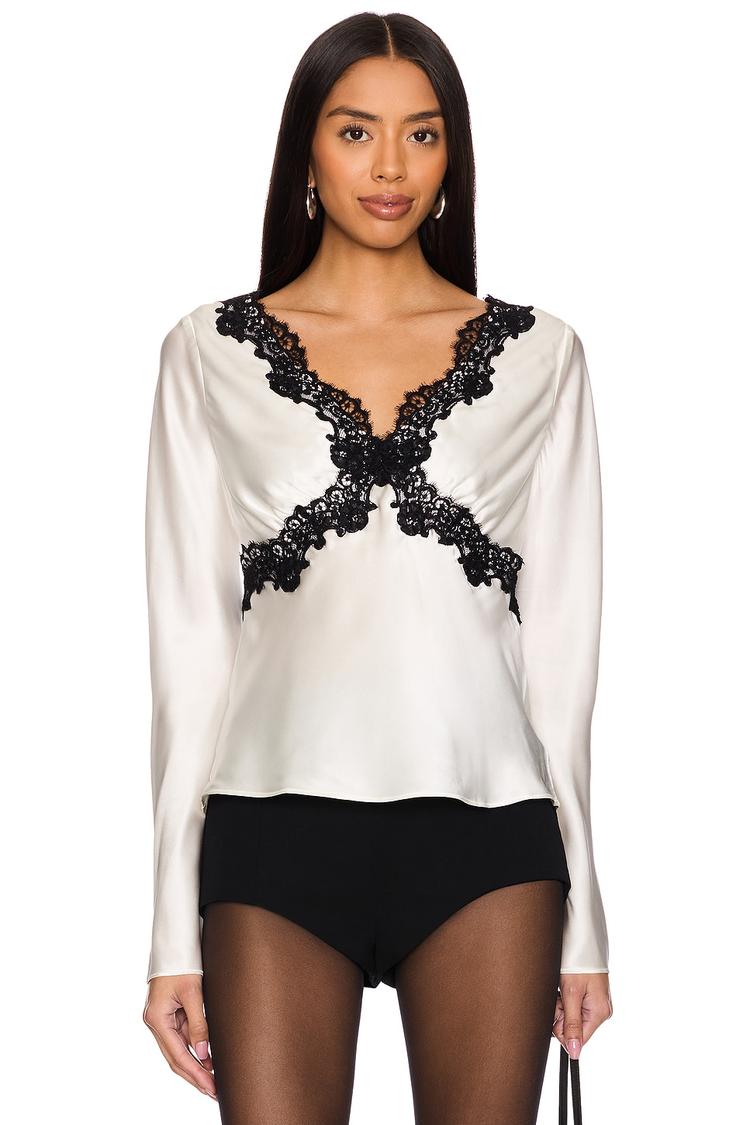 Softly draped in lightweight satin silk, this elegant shell top features a flattering V-neck and long, regular sleeves for refined coverage. The hip-length silhouette sits gracefully with a regular fit, enhanced by intricate black lace trim adorning the front and back, adding a sophisticated contrast to the matte ivory base. A concealed back zipper ensures a sleek finish. Ideal for casual outings, brunches, or date nights, this chic and versatile top blends luxurious fabric and delicate design details for a timeless, polished look.