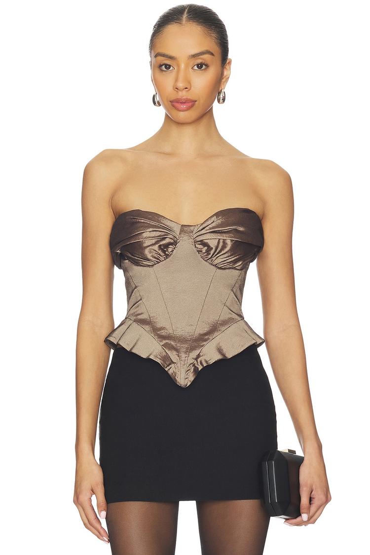 Structured boning and a fitted silhouette define this matte taupe bustier-style corset top. Featuring outline bra cups and a ruffled hem, the strapless straight neckline emphasizes a chic, sexy vibe. Crafted from a smooth polyester-nylon blend with elastane for stretch, it fastens with a back zipper closure for a sleek finish. Ideal for night outs, date nights, or girls' nights, this waist-length top pairs perfectly with tailored pants or skirts to create a modern, alluring look.