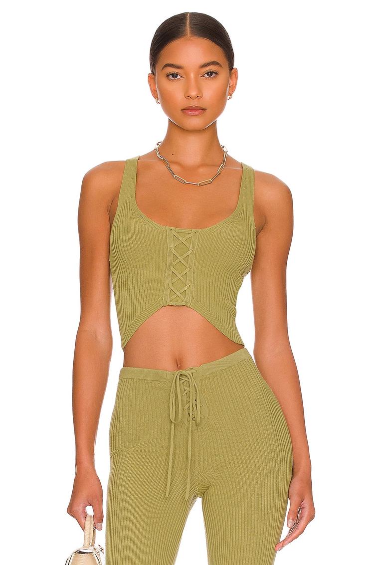 A sleek rib-knit corset tank in a matte olive hue brings a modern edge to your warm-weather wardrobe. The fitted, cropped silhouette with wide straps and a square neckline flatters the figure, while the lace-up front adds a chic, corset-inspired detail. Crafted from a midweight rayon-nylon blend, this knit top offers comfort and subtle stretch. Ideal for casual outings, brunch dates, or night outs, it blends trendy style with everyday ease for versatile spring and summer dressing.