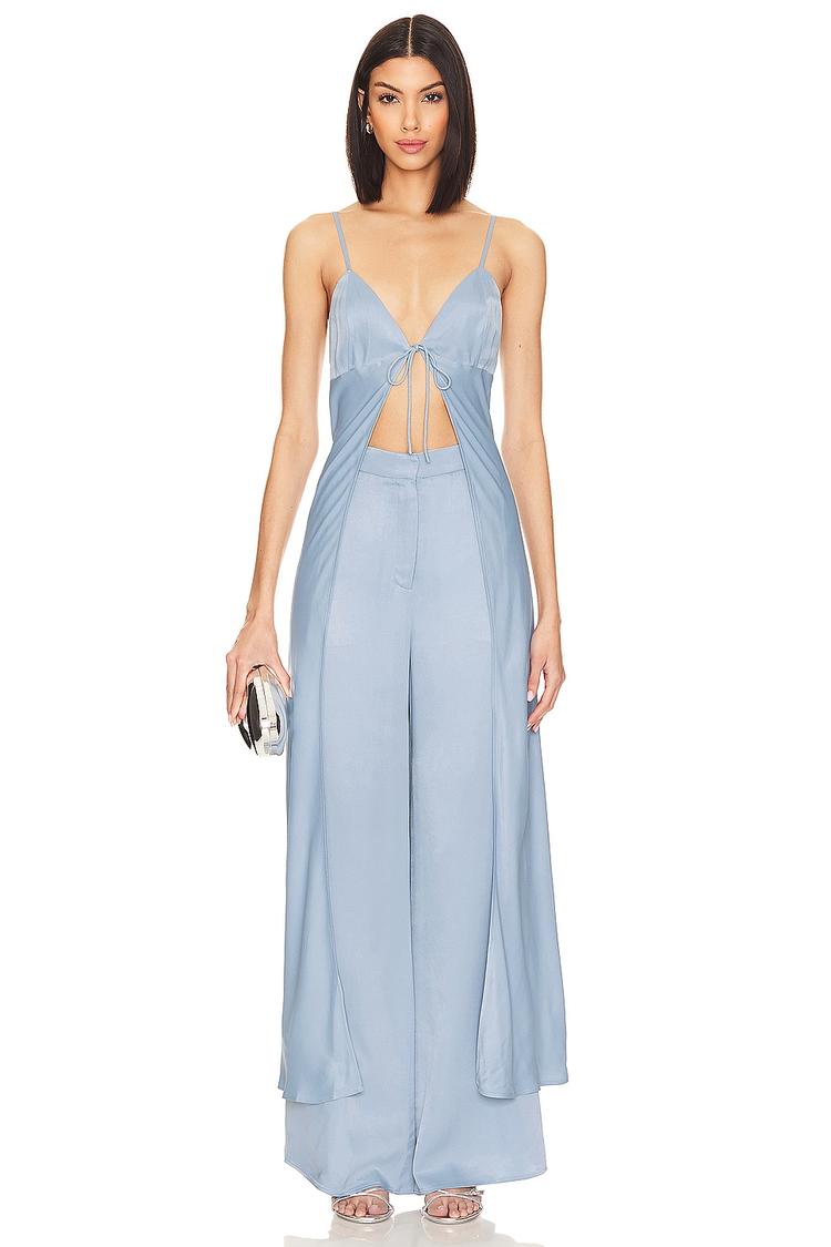 Lightweight charmeuse fabric and a slim fit create a captivating silhouette in this thigh-length camisole top. Featuring a deep V-neckline and delicate spaghetti straps, this modern and sexy piece is finished with an open front tie closure that adds effortless charm. Its matte light blue hue enhances its chic appeal, making it a versatile choice for casual outings, brunches, or night outs during spring and summer. The covered back and sleeveless design provide comfort and ease, perfect for warm weather styling.