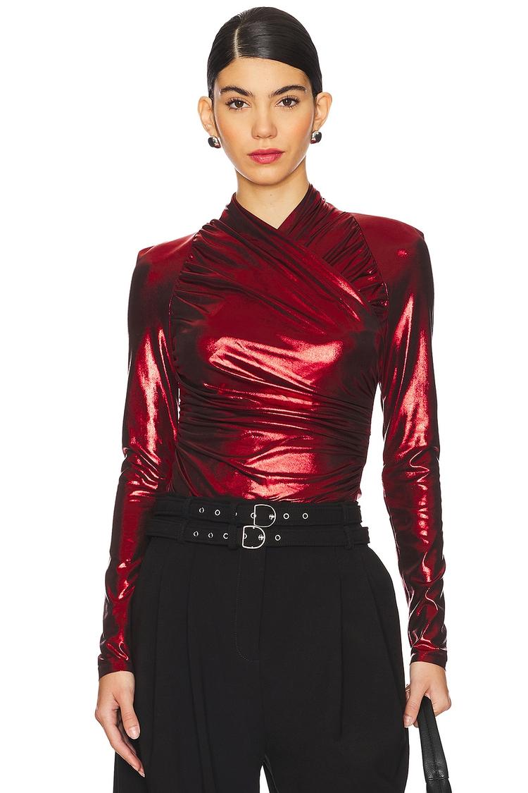 Shimmering metallic red jersey defines this fitted wrap top with a sleek waist-length silhouette. Featuring long regular sleeves and a chic wrap neckline, it offers a modern and sexy vibe perfect for night outs, date nights, or cocktail events. The concealed back zipper ensures a smooth, covered back finish, while the midweight coated fabric adds a subtle sheen and structure. This versatile piece blends contemporary style with standout metallic texture, making it an excellent choice for evening wear and special occasions.