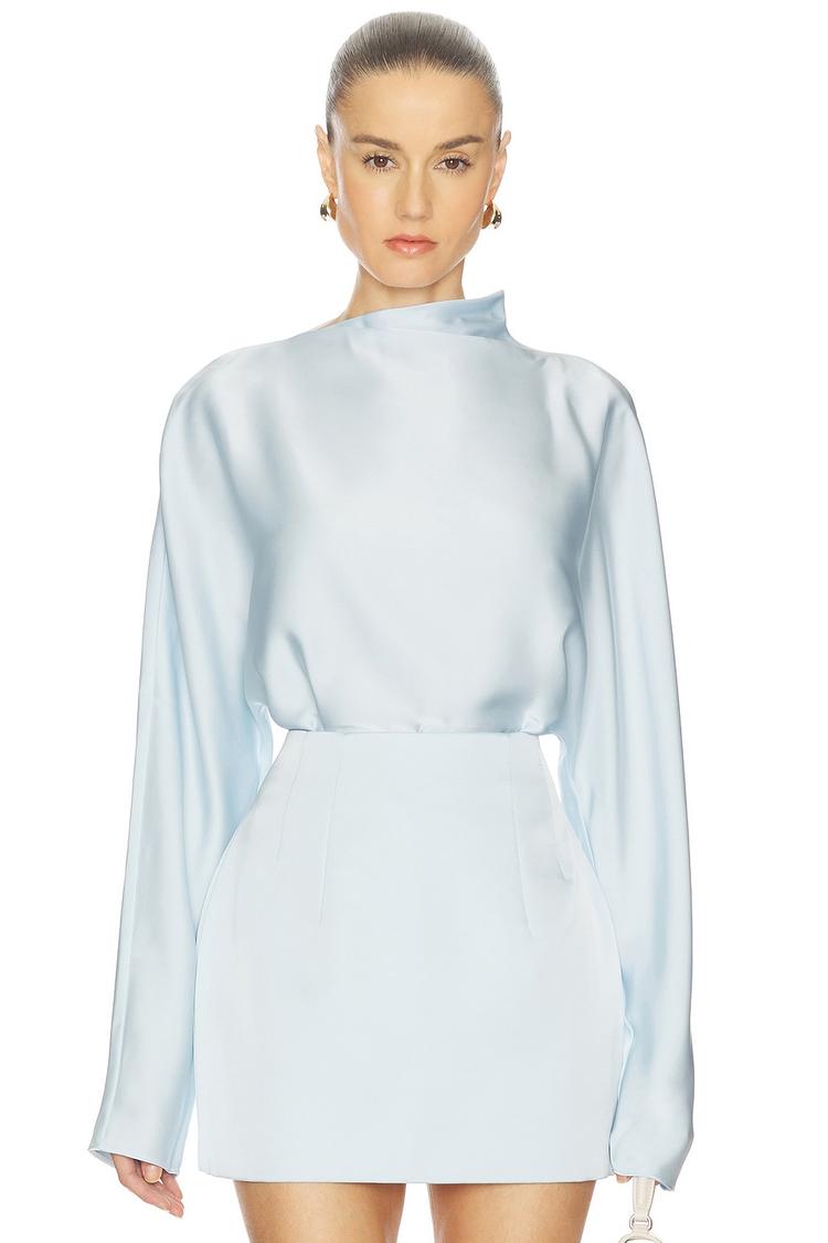 Soft light blue polyester with a smooth sheen defines this relaxed blouson top featuring an asymmetric neckline for a modern edge. Long sleeves end in distinctive flare cuffs, adding subtle drama to its minimalist silhouette. The hip-length cut and hidden shoulder zipper closure enhance clean lines and ease of wear. Ideal for versatile occasions such as casual outings, office workwear, business casual events, brunches, and date nights, this elegant piece brings sophistication with understated charm.