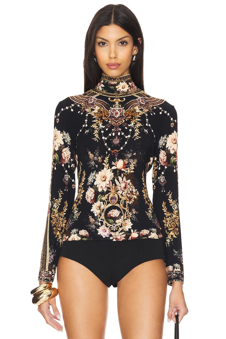 Enchanting floral-on-black jersey top that elevates everyday dressing into a moment of luxe ease. Crafted in lightweight modal with a touch of elastane, the mock neck drapes to a hip-length silhouette with a fitted feel and long sleeves. Crystal embellishments trace the neckline and cuffs, catching the light as you move. The ornate floral print in cream, beige, gold and blush reads sophisticated yet bohemian-ready. A versatile pullover you can wear solo with tailored pants or layer under a blazer for work, or style with a sleek skirt for date nights. Effortless comfort meets statement luxury in this Camilla piece.