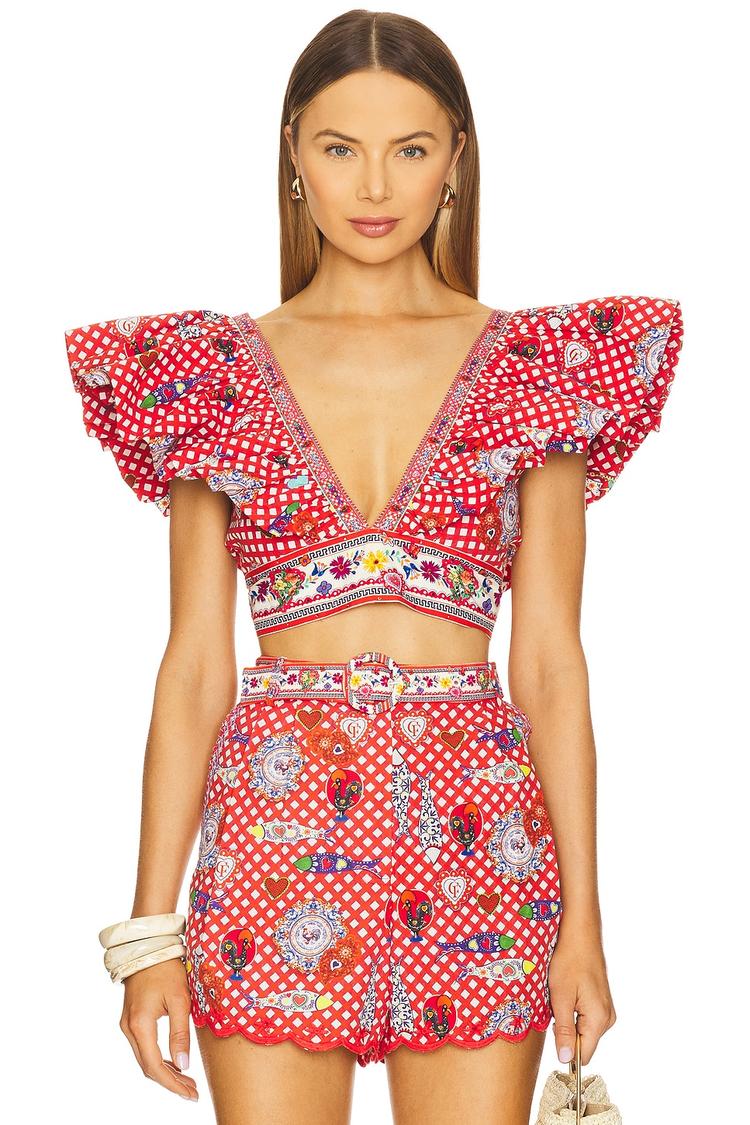 Vibrant red hues with playful white polka dots and floral accents come alive in this cropped wrap top crafted from organic cotton and linen. The plunging V-neck and dramatic flounce sleeves create a flared silhouette perfect for warm spring and summer days. Sequined ruffles embellish the hem and sleeves, adding a subtle shimmer that elevates the boho chic style. The self-tie back closure ensures a customizable fit, making it an ideal choice for casual outings, brunch dates, or vacation adventures.