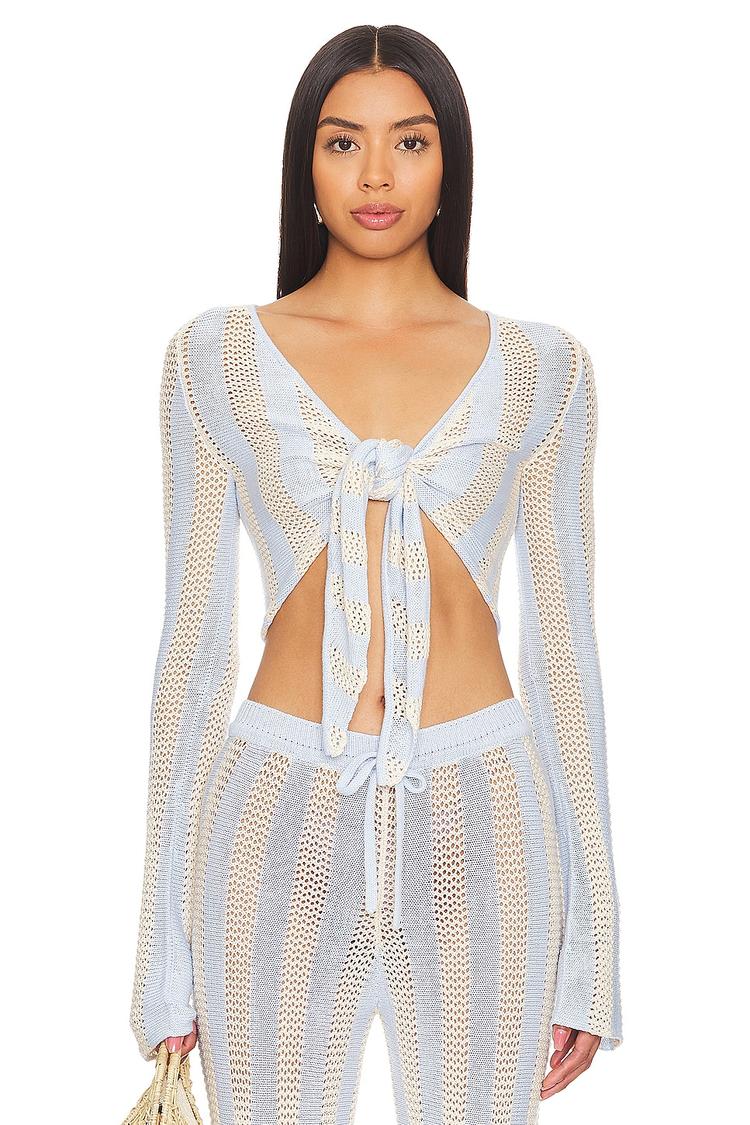 Lightweight open-knit fabric and a cropped silhouette define this slim-fitting Paloma Top with a deep V-neck and long regular sleeves. The front tie-up closure adds a playful and adjustable detail, while the striped pattern in matte white and beige offers a breezy bohemian vibe perfect for spring and summer. This versatile piece works effortlessly for casual beach days, vacations, or relaxed weekend outings, pairing well with high-waisted bottoms for a chic layered look.