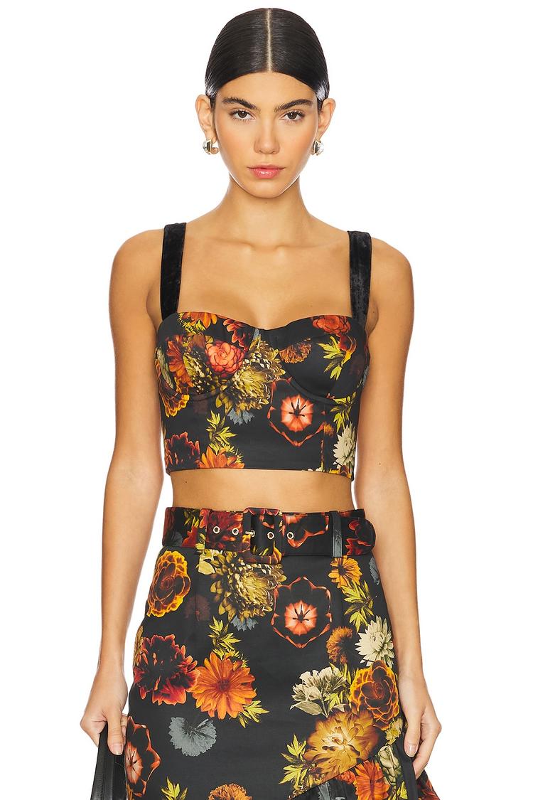 Bold floral motifs bloom across this fitted cropped top, crafted from lightweight crepe fabric with a matte black base. The sweetheart neckline and wide velvet straps add a romantic touch, while the smocked back ensures comfortable stretch. Lightly padded underwire cups provide subtle lift and shape. This versatile piece pairs effortlessly with skirts or high-waisted pants, ideal for casual outings, brunch with friends, or date nights. The concealed back zipper closure keeps the silhouette sleek and polished.