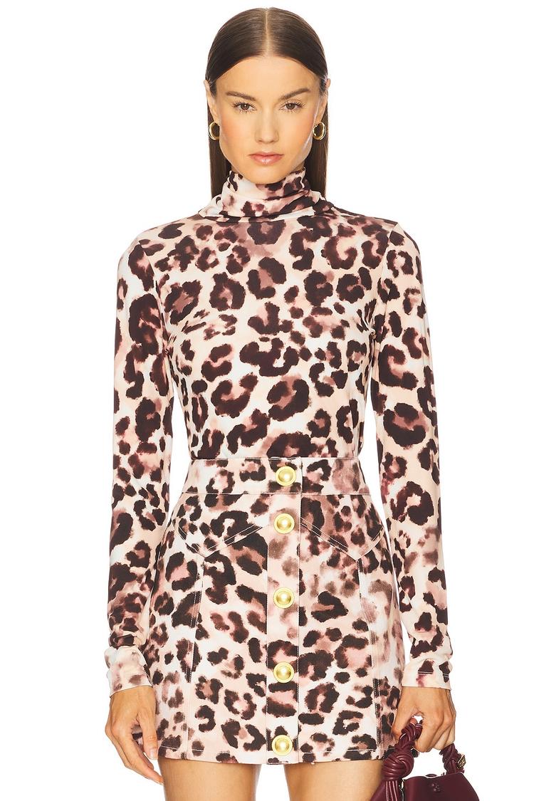 Shimmering with a chic animal print, this slim-fit tunic top features a classic mock neck and long regular sleeves crafted in midweight jersey fabric. The thigh-length hem and full button closure create a polished yet trendy silhouette, perfect for autumn and winter days. Ideal for casual outings, brunch dates, or smart workwear settings, it offers versatile styling options. The beige base highlighted by rich brown and dark brown spots adds a sophisticated edge to any wardrobe, making it a standout piece for those who love modern and fashionable prints.