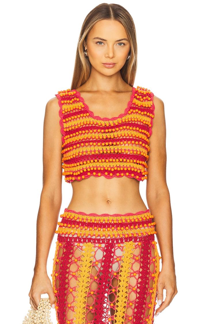 Vibrant bright red and orange hues define this cropped sleeveless top crafted in breathable cotton, featuring a U-neck and wide straps for comfortable wear. The regular fit and pullover design make it an easy choice for warm weather, while the all-over beaded embellishments add a bohemian, casual chic vibe. Its semi-sheer fabric brings a light, airy feel perfect for spring and summer occasions like brunch, casual outings, or vacation days. Pair with high-waisted skirts or pants for a playful, stylish look.