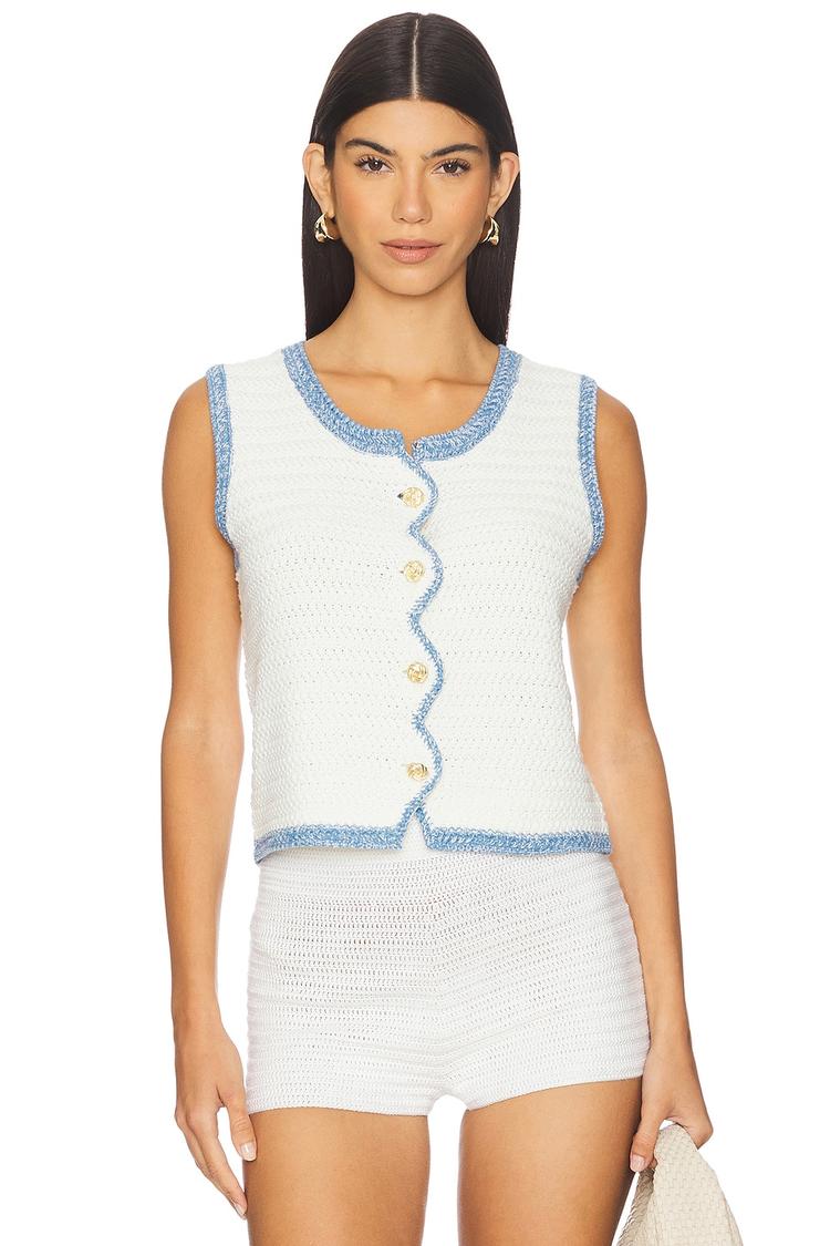 Soft midweight crochet fabric and a fitted silhouette define this cropped tank with a classic round neckline and wide straps. The delicate blue scalloped ruffle trim along the edges adds a subtle feminine touch, complemented by shiny gold-tone button closures down the front. Crafted from a cotton-acrylic blend, this semi-sheer piece is perfect for spring and summer days. Ideal for casual outings, brunch dates, or vacation wear, its breathable design offers both comfort and style with a minimalist yet elegant vibe.
