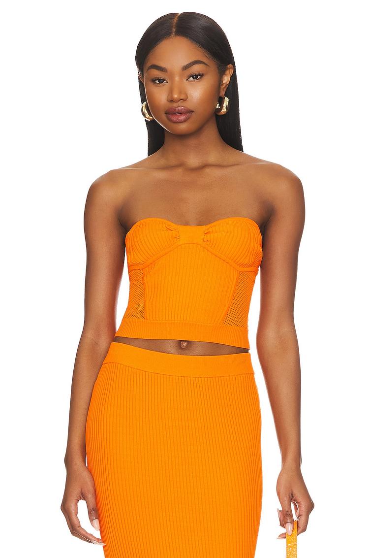 Bright orange ribbed knit jersey fabric shapes this chic cropped corset top with a straight strapless neckline and fitted silhouette. The bust seam detail adds subtle structure to the bodice, enhancing the sleek, sexy look. Ideal for spring and summer, this slip-on style pairs effortlessly with high-waisted skirts or pants for casual outings, brunch dates, or vibrant night outs. Crafted from a comfortable cotton blend, it brings both style and breathable comfort to your seasonal wardrobe.