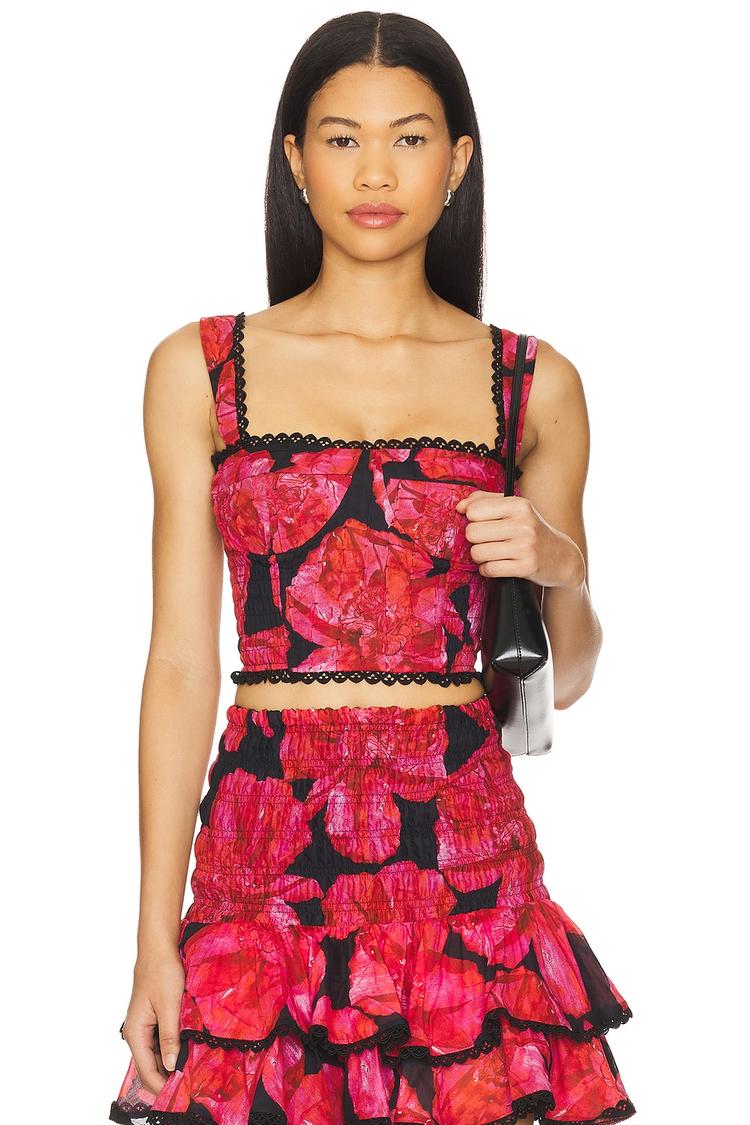 Bold and romantic, this fitted cropped corset top features a striking bright rose floral print over a black base, enhanced with a structured boned bodice and scalloped black lace trim along the square neckline and hem. The wide straps and sleeveless design offer a fresh, summery vibe, crafted in a lightweight cotton-polyester blend that ensures comfort and breathability. Ideal for casual outings, brunch dates, or vibrant night outs, this chic piece pairs beautifully with high-waisted skirts or pants for a confident, bohemian-inspired look.