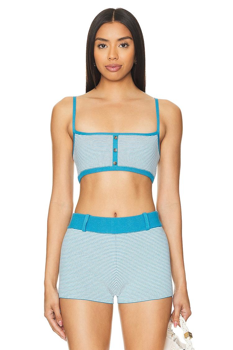 Light blue stripes paired with bright blue accents define this cropped, fitted top featuring a square neck and slender spaghetti straps. Crafted from a comfortable cotton-polyester blend, its sleeveless silhouette and button closure at the front add subtle charm. Ideal for casual outings, loungewear, or sleepwear, this minimalistic piece offers a fresh and breezy vibe perfect for spring and summer days. The clean lines and striped pattern provide a chic yet relaxed look suitable for everyday wear or laid-back social occasions.