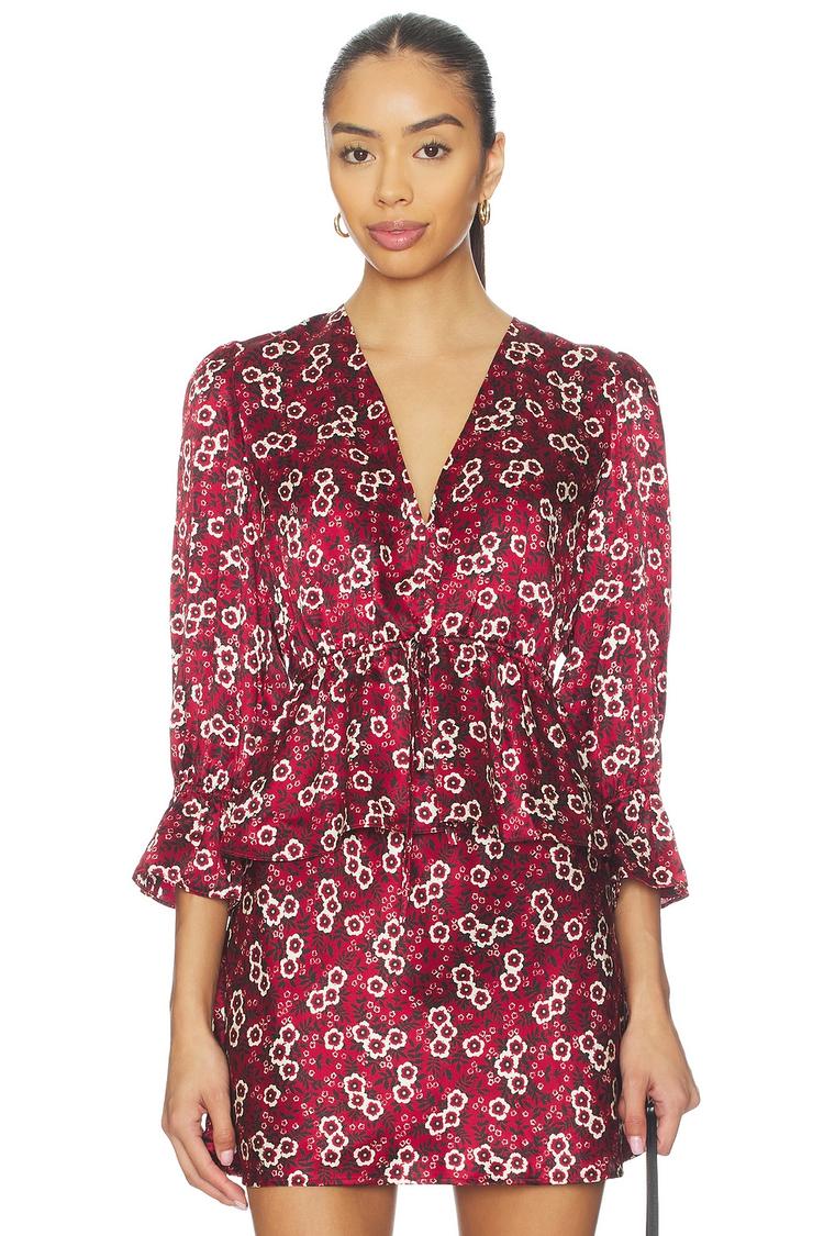 Soft charmeuse silk drapes elegantly in this thigh-length wrap top featuring a deep V-neck and three-quarter cuffed sleeves with elasticized detail for comfortable movement. The abstract off-white print on a matte burgundy base adds a romantic and chic vibe, perfectly suited for spring to autumn wear. A tie-up closure at the waist enhances the relaxed fit, allowing for flattering silhouette adjustments. Ideal for casual outings, brunch dates, or night outs, this refined piece balances comfort with timeless elegance.
