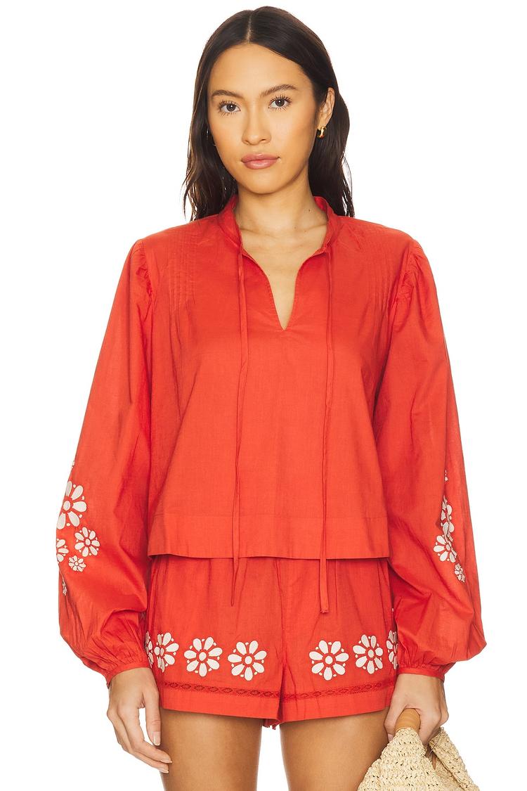 Lightweight cotton and airy balloon sleeves define this loose-fitting blouson top with a hip length silhouette. Its distinctive tie neck closure and embroidered floral details at the cuffs add a refined bohemian charm. The vibrant matte red hue paired with crisp white embroidery brings a fresh, casual chic vibe perfect for spring and summer outings. Whether you're headed for brunch, a relaxed vacation day, or casual weekend gatherings, this top delivers effortless style and comfort.