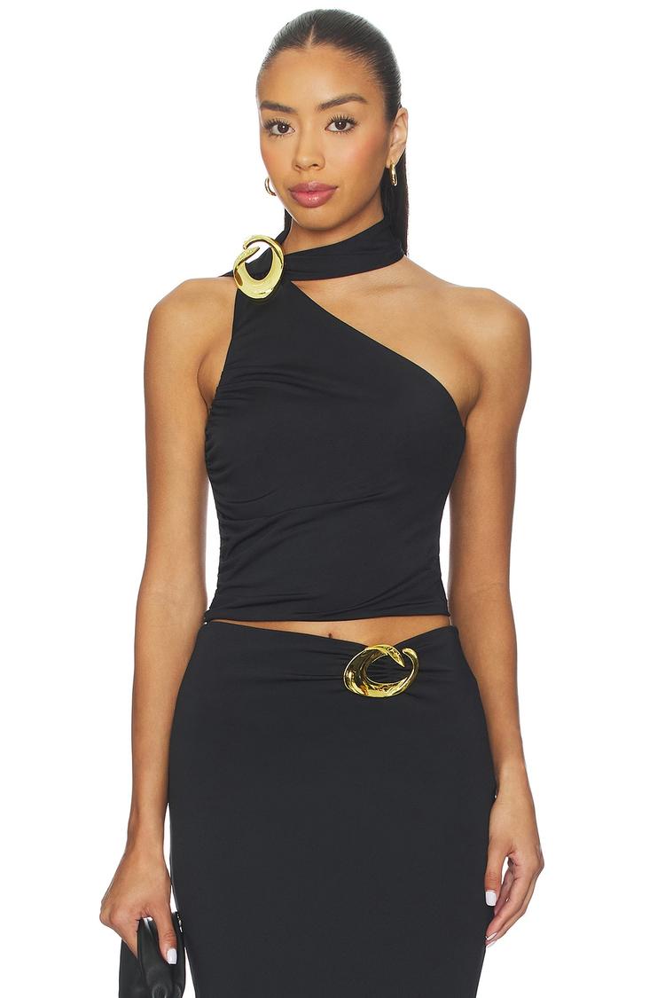 Sleek and modern, this cropped one-shoulder top in matte black jersey features a bold asymmetric neckline and a striking metallic gold buckle accent on the shoulder. The fitted silhouette hugs the body for a sexy appeal, while the sleeveless and strapless styling enhances its chic, contemporary vibe. Perfectly suited for warm spring and summer evenings, this versatile piece transitions effortlessly from casual days out to sophisticated night outs and romantic date nights.