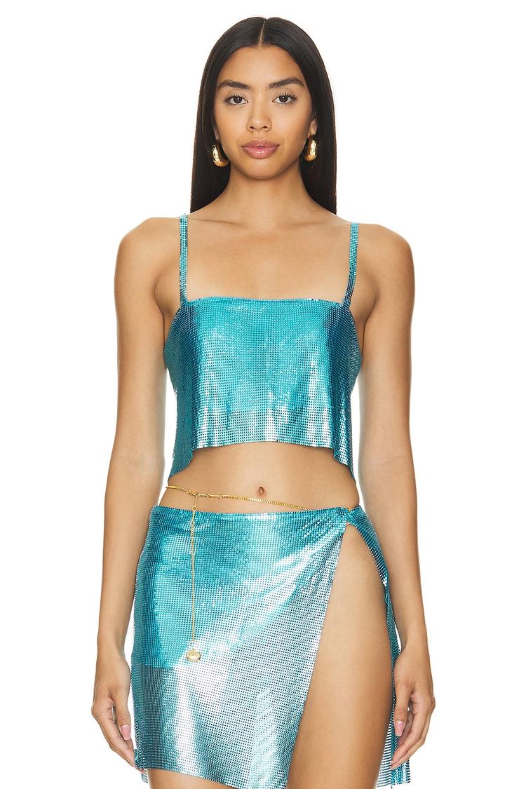 Shimmering bright turquoise chainmail crafted with a slim cropped silhouette highlights a modern square neckline and delicate spaghetti straps for a sexy appeal. The back features a tie-back hook closure with chain detail adding an edgy finish. Perfect for summer nights, cocktail parties, or date nights, its viscose lining ensures comfort beneath the metallic shine. This trendy cropped top pairs effortlessly with skirts or pants for a standout look that embraces bold style and contemporary glamour.