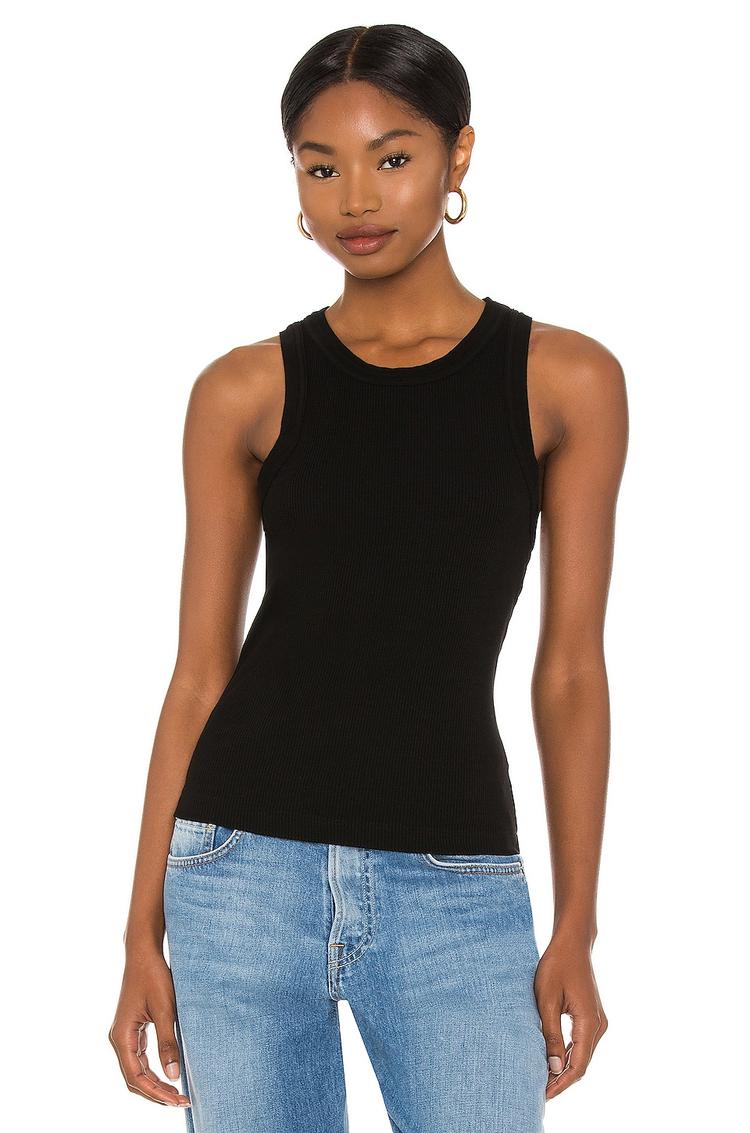 Ribbed jersey fabric and a fitted silhouette define this black crew neck tank top, featuring wide straps and a sleeveless design for warm-weather comfort. Crafted from a blend of organic cotton, lyocell, and elastane, it offers breathable stretch and a sleek finish. The hip-length cut makes it a versatile foundation piece ideal for casual outings, everyday wear, and travel adventures. Minimalist and casual chic in style, this tank pairs effortlessly with jeans or layered under jackets for a polished yet relaxed look.