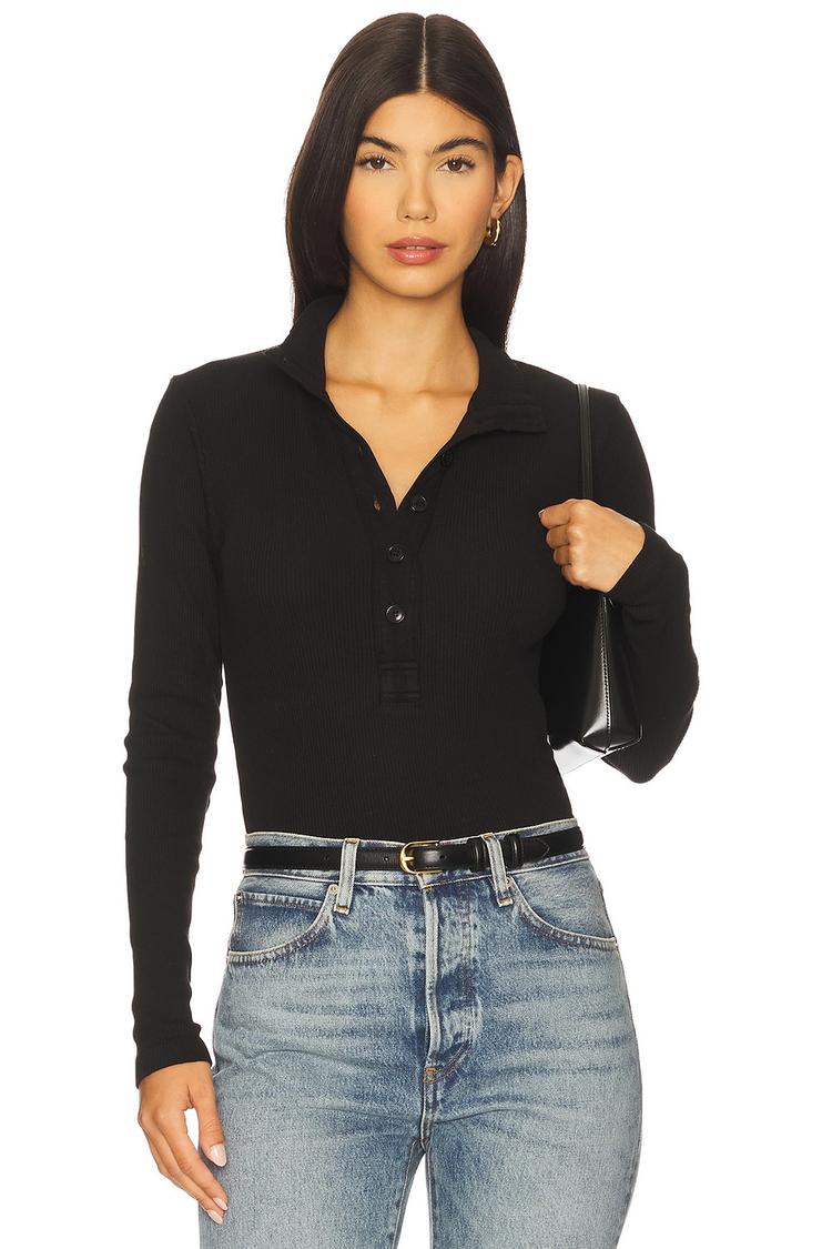The Sheena Henley blends a classic V-neckline with a slim fit in a midweight ribbed jersey fabric, offering a comfortable stretch from its spandex and lyocell blend. Its long sleeves and front partial button closure deliver timeless style, making it ideal for casual days, workwear, or travel. The matte black hue enhances its minimalist appeal, while the hip-length cut ensures versatile pairing with jeans or skirts for a polished everyday look.