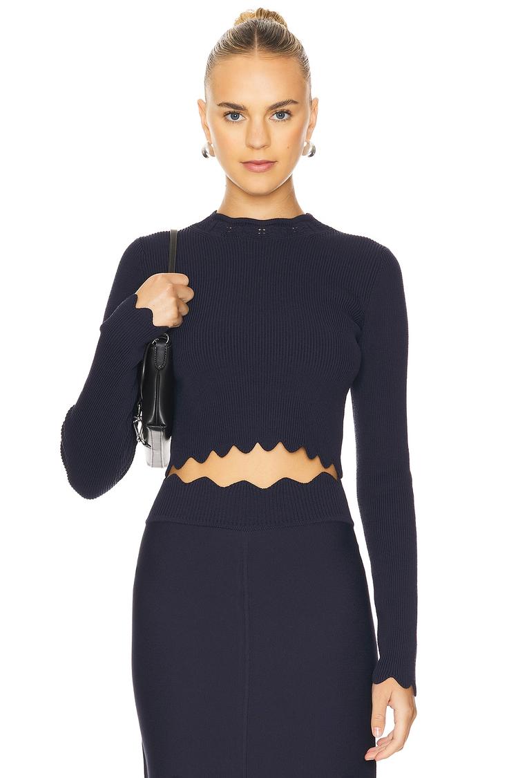A refined silhouette with a fitted, cropped cut crafted from smooth ponte fabric. This navy knit top features a classic crew neck and long, regular sleeves, while its standout scalloped hem adds a playful ruffle detail for a contemporary edge. Ideal for layering or standalone styling, it effortlessly suits casual outings, workwear settings, and brunch dates. The pullover design ensures easy wearability, making it a versatile piece for transitional seasons like autumn and spring.