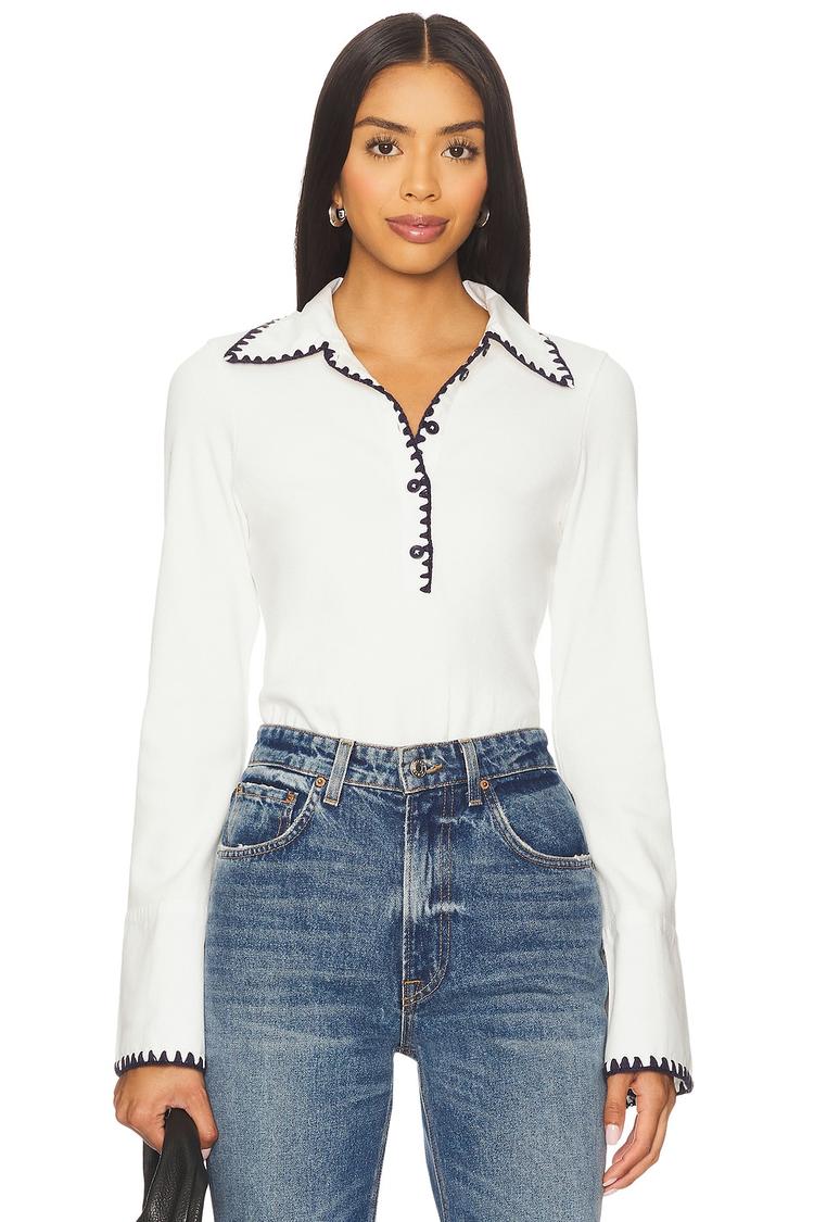A crisp white ribbed jersey Henley top features a fitted silhouette with long sleeves and a partial front button closure. The classic henley neckline is accented by contrast black whipstitch trim along the collar, cuffs, and button placket, adding subtle artisanal detail. Crafted from a comfortable cotton-elastane blend, this hip-length top delivers both stretch and structure. Ideal for casual days, brunch outings, or casual workwear, it pairs effortlessly with jeans or skirts for a minimalist, chic vibe during spring, autumn, or winter seasons.