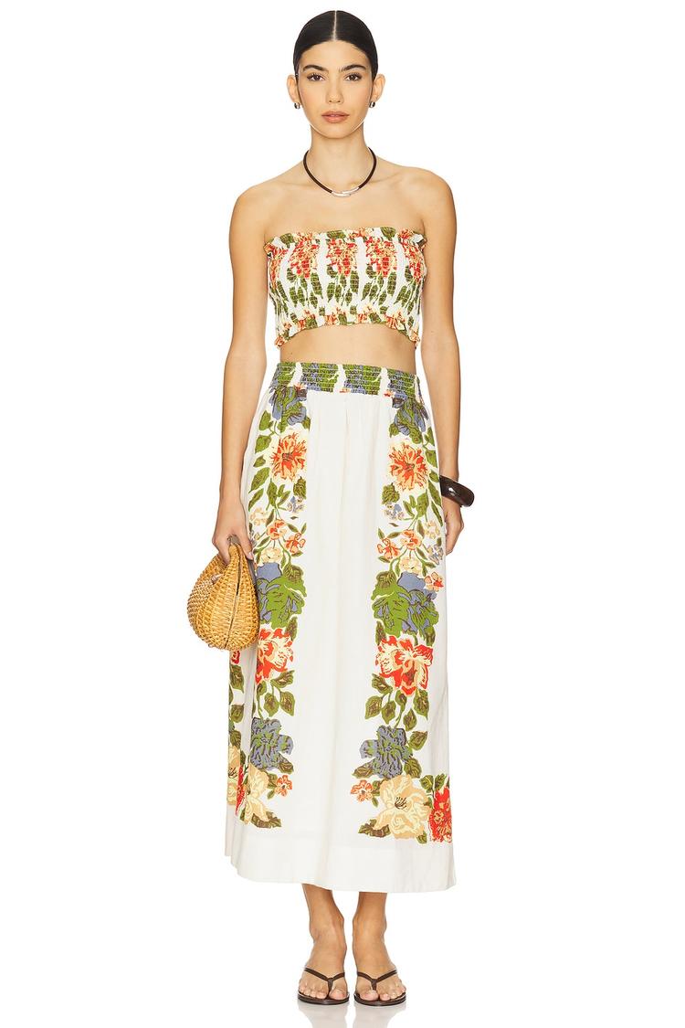 Soft cotton-linen blend and a strapless silhouette create a relaxed, breezy vibe in this cropped Ruby Top. Adorned with vibrant all-over floral prints in green and orange hues on a crisp white base, it pairs effortlessly with matching bottoms for a cohesive bohemian look. The pullover fit and sleeveless style make it ideal for warm spring and summer days. Perfect for casual outings, beach vacations, or brunch dates, this crop top blends comfort and style with a laid-back, chic flair.