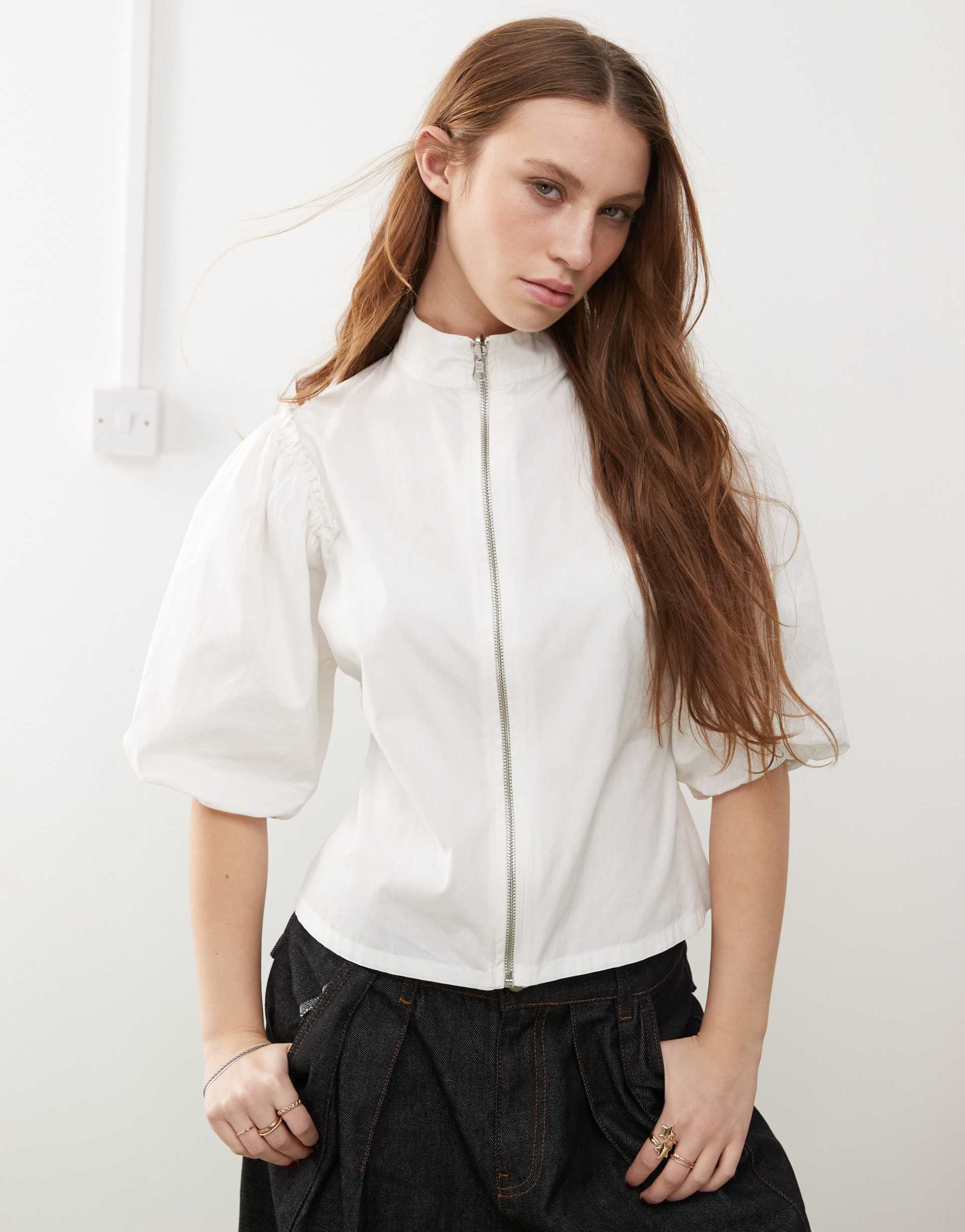 COLLUSION BUBBLE SLEEVE TOP WITH ZIP DETAIL IN WHITE