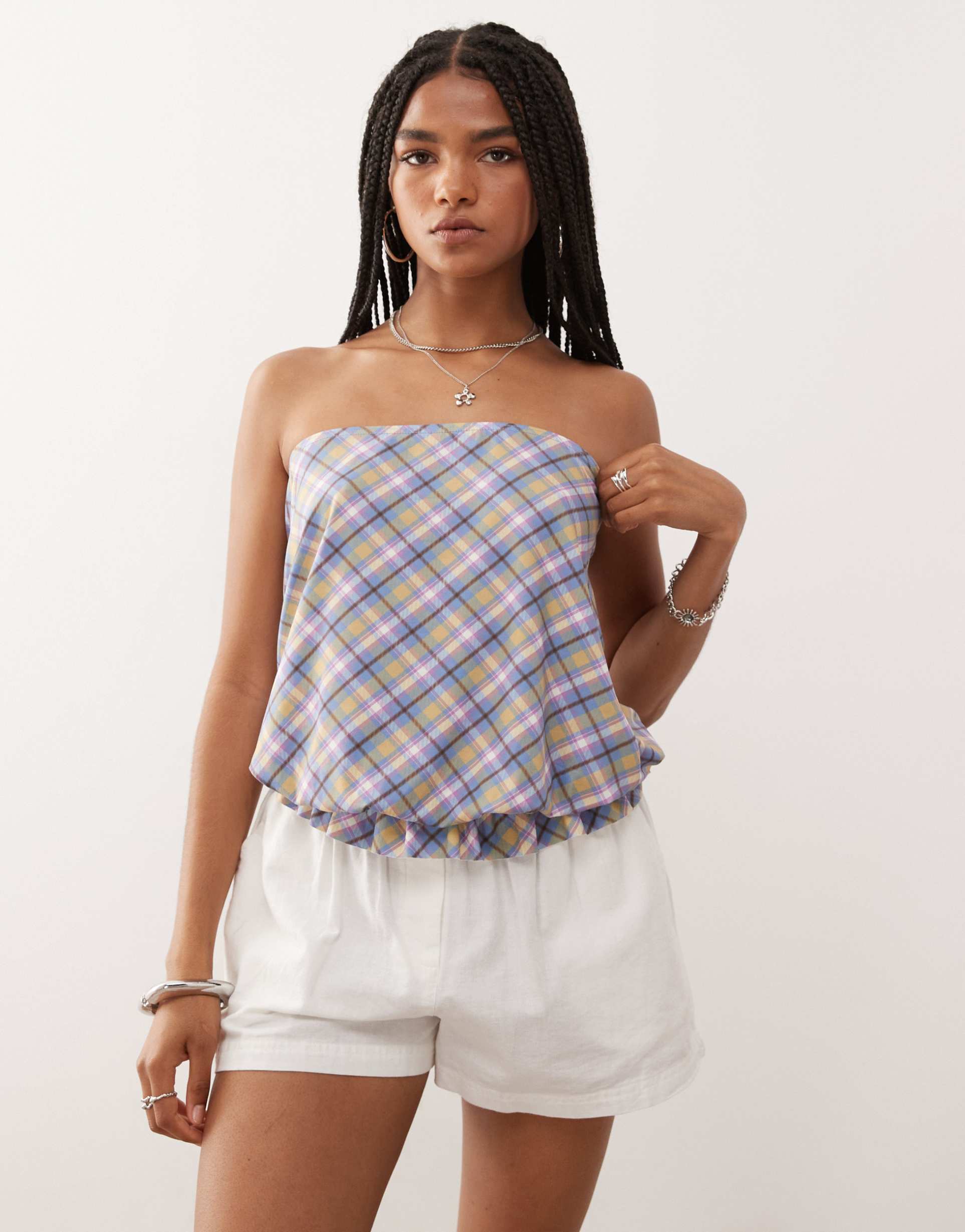 Soft and stretchy polyester-elastane blend forms this trendy bandeau top featuring an all-over blue and white checkered pattern. Designed with a regular fit and strapless neckline, it offers a breezy sleeveless style perfect for warm spring and summer days. The waist-length hem is finished with delicate ruffles, adding a playful touch to the casual chic silhouette. Ideal for casual outings, brunch dates, or everyday wear, this slip-on top combines comfort with eye-catching design for versatile seasonal layering.