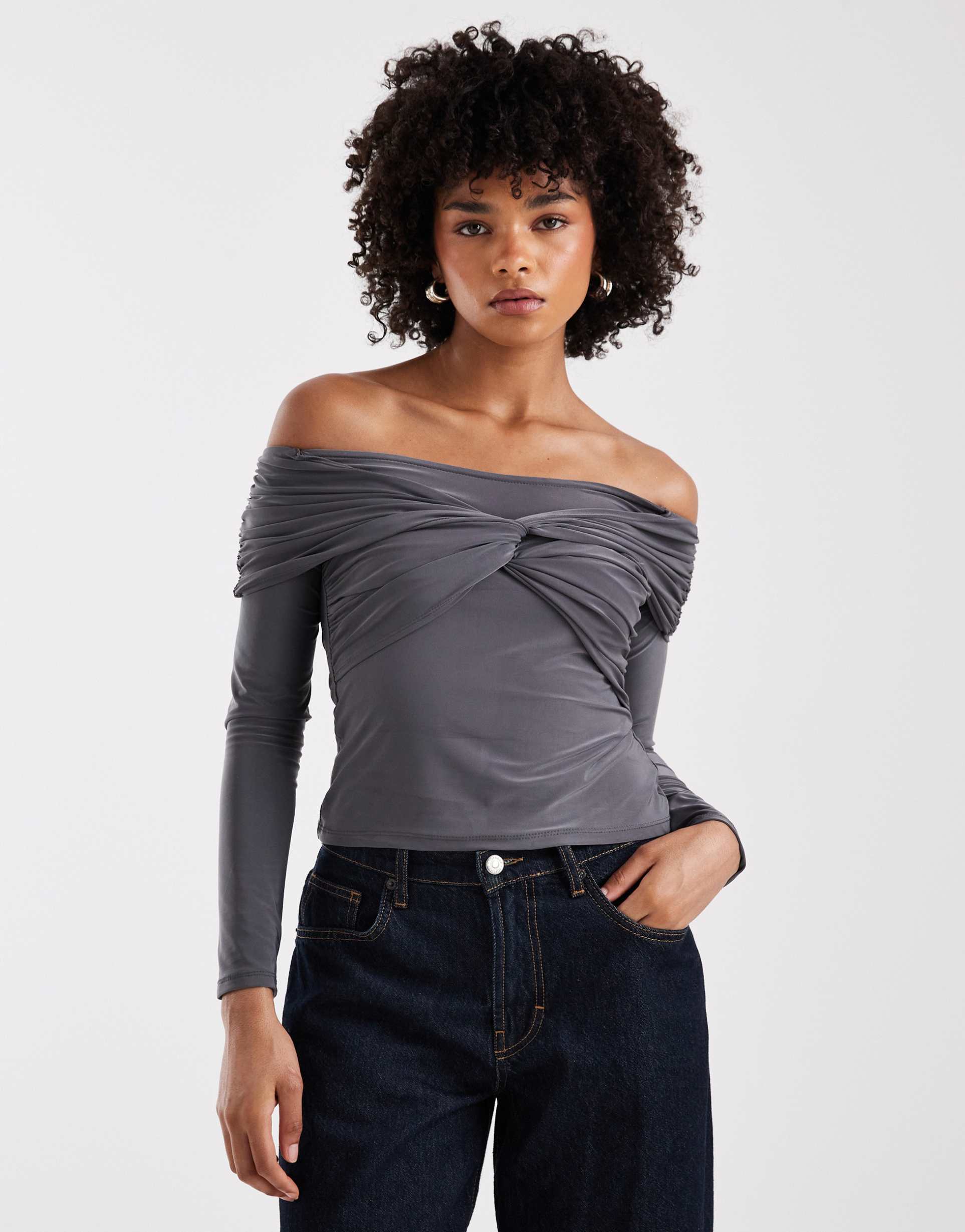 COLLUSION HEAVYWEIGHT SOFT TOUCH OFF-SHOULDER TWIST TOP IN CHARCOAL