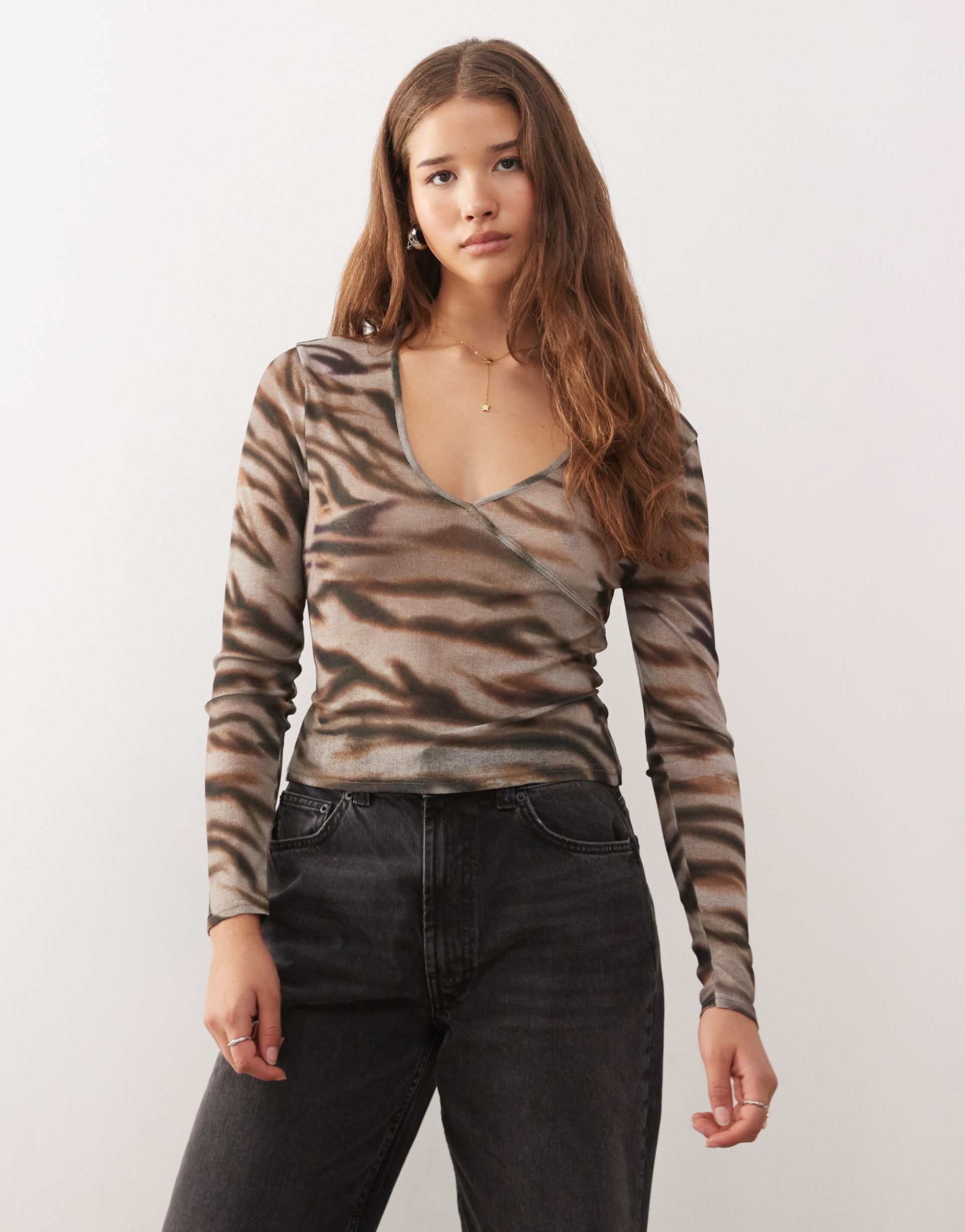 A chic mesh wrap top featuring an all-over tiger animal print in matte brown and black hues. Crafted from a fine, stretchy, and soft sheer mesh fabric with 100% cotton main, it offers a comfortable regular fit with long regular sleeves. The deep V-neckline and waist-length hem provide a flattering silhouette ideal for casual outings, street style looks, and night outs. The covered back and wrap closure add subtle elegance, making this top a versatile addition to your seasonal wardrobe for spring and autumn.