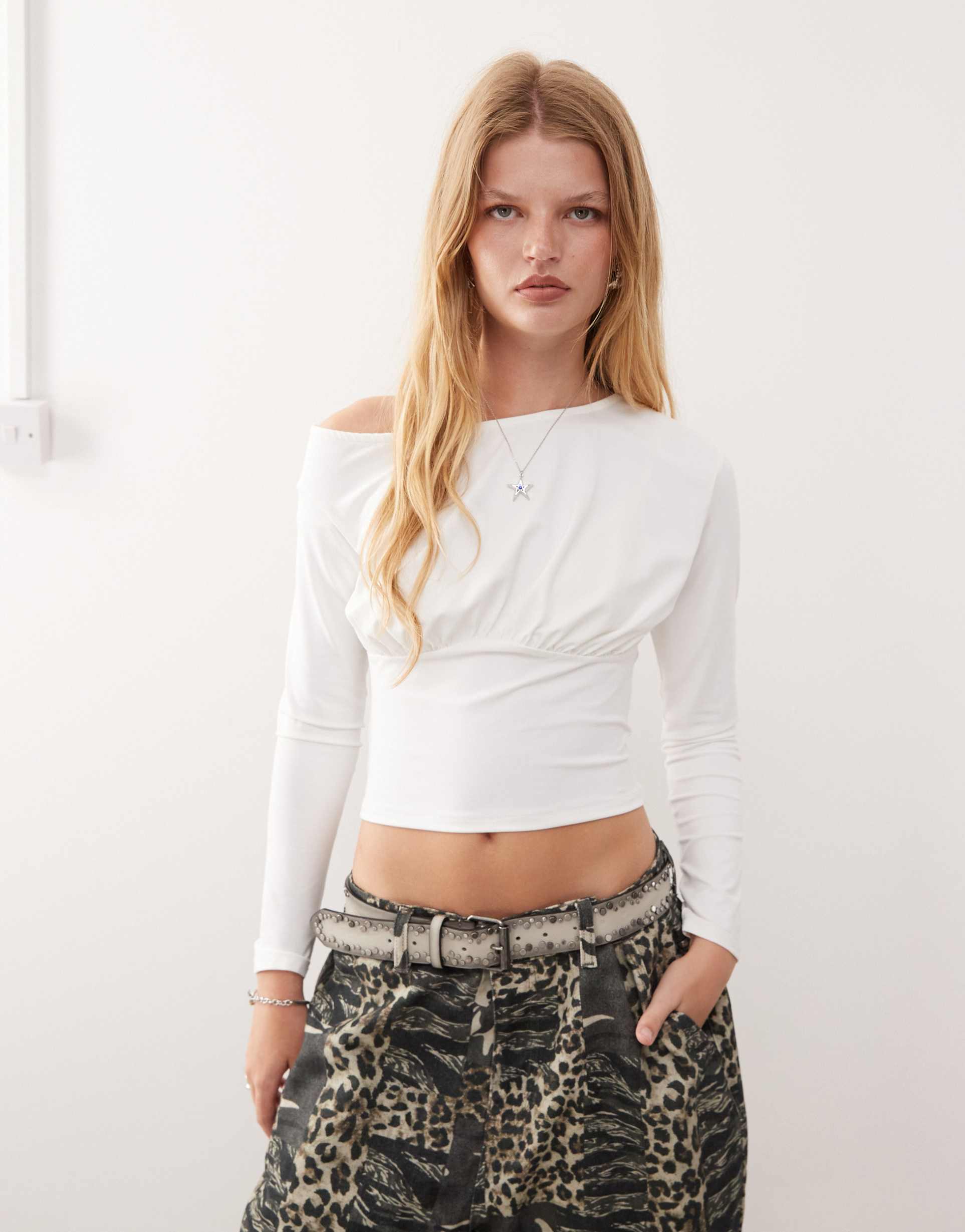 Soft white cotton mesh shapes this fitted, cropped top with an off-shoulder neckline that highlights the shoulders elegantly. Long sleeves and front ruching at the waist add delicate detail and flattering texture, while the sheer fine mesh fabric lends a modern, airy feel. Perfect for warm spring and summer days, this versatile piece suits casual outings, streetwear looks, and brunch dates with friends. Its minimalist style and clean silhouette make it a chic addition to any wardrobe seeking understated sophistication.